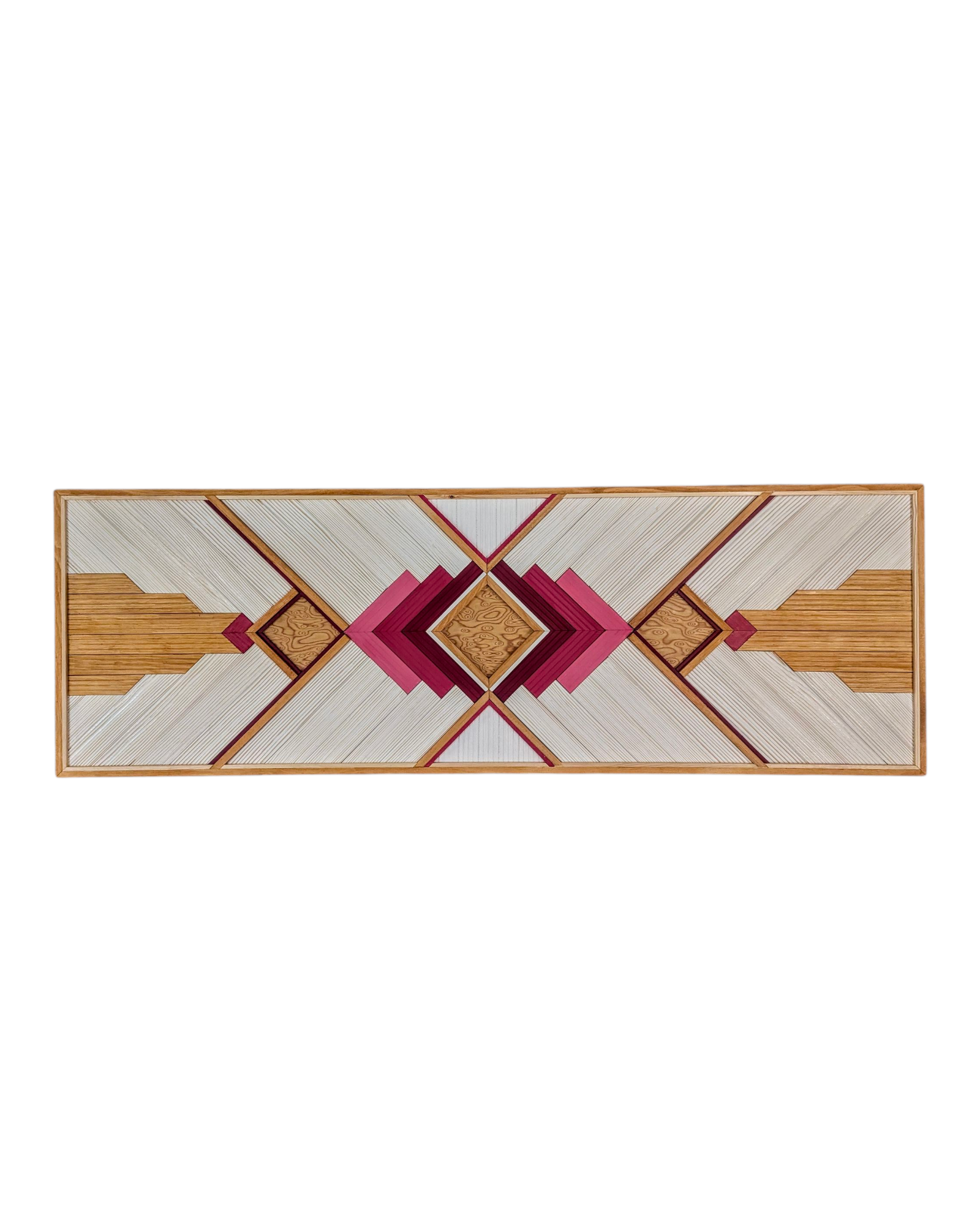 Réalisée à partir de tasseaux de pin et d’ayou, elle joue sur les contrastes entre bois clair, textures marquées et touches de rose profond au centre. Ce rose vibrant agit comme une pulsation visuelle, subtile mais affirmée, qui attire l’œil sans perturber l’harmonie d’ensemble.