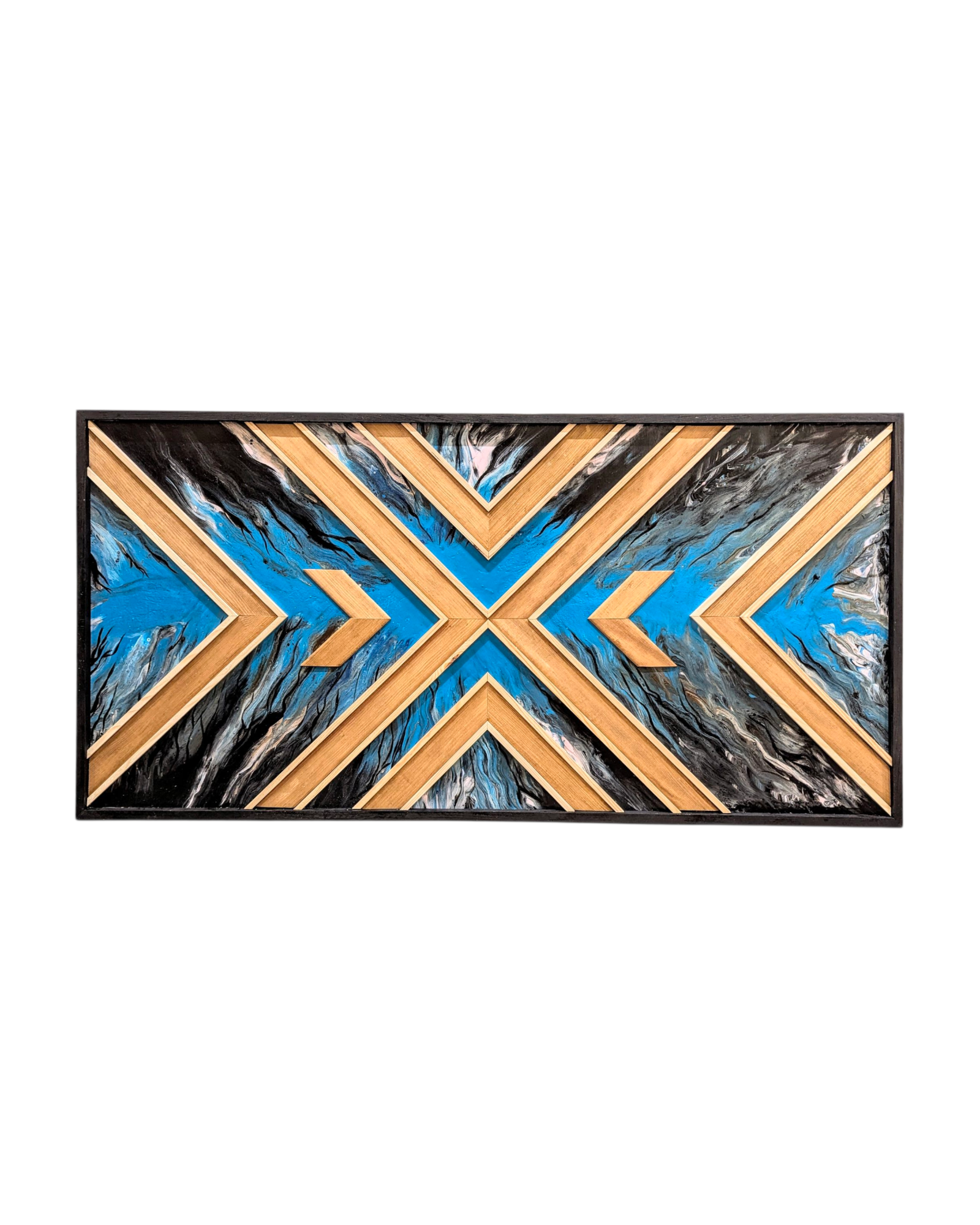 Cette œuvre combine une structure graphique en bois avec des inserts de peinture acrylique coulée, créant un contraste fort entre rigueur géométrique et mouvement fluide. Les chevrons et flèches en bois naturel dessinent une composition dynamique, tandis que les zones peintes évoquent des flux d’énergie, des matières en fusion, ou encore des paysages abstraits vus de haut.