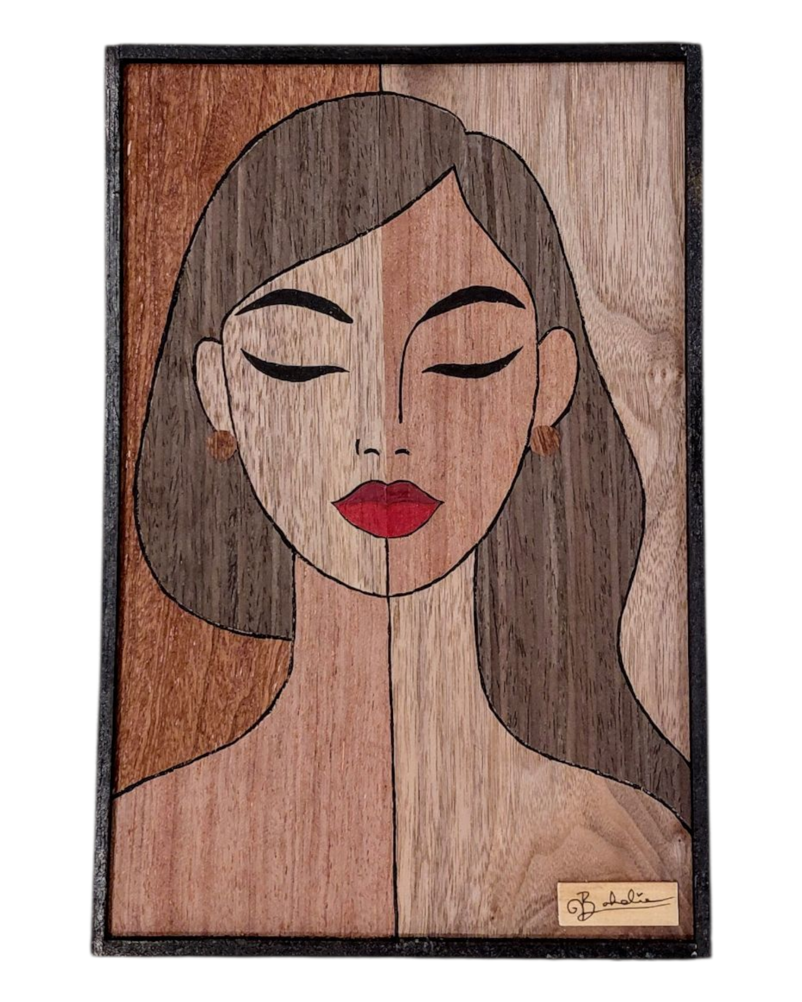 Réalisées en marqueterie fine associée à la peinture, ces œuvres jouent sur les contrastes de tons de bois et les textures naturelles pour suggérer l’élégance et la fragilité assumée. Chaque portrait est une méditation sur la dualité : force et douceur, lumière et ombre, modernité et romantisme vintage.
