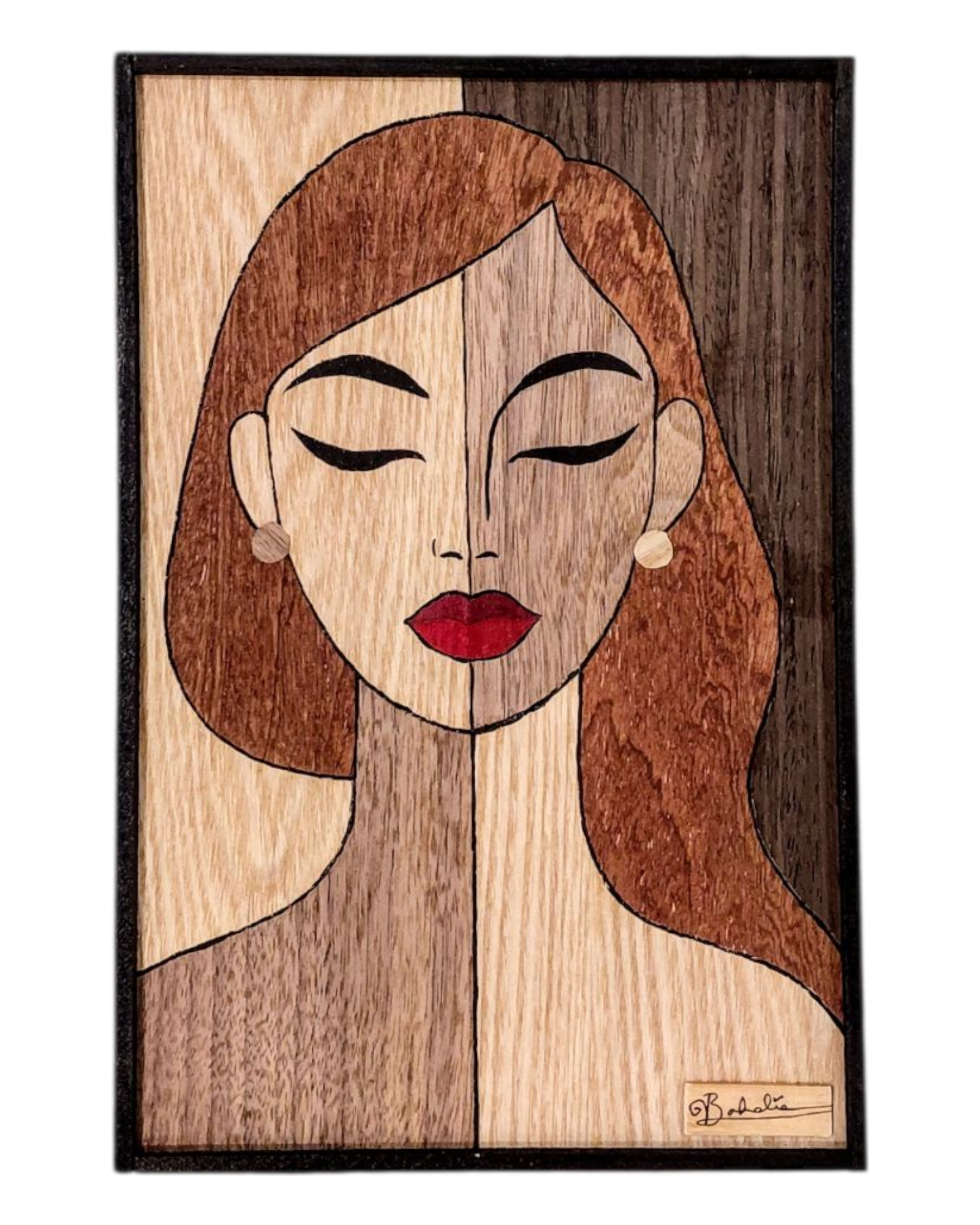 Réalisées en marqueterie fine associée à la peinture, ces œuvres jouent sur les contrastes de tons de bois et les textures naturelles pour suggérer l’élégance et la fragilité assumée. Chaque portrait est une méditation sur la dualité : force et douceur, lumière et ombre, modernité et romantisme vintage.