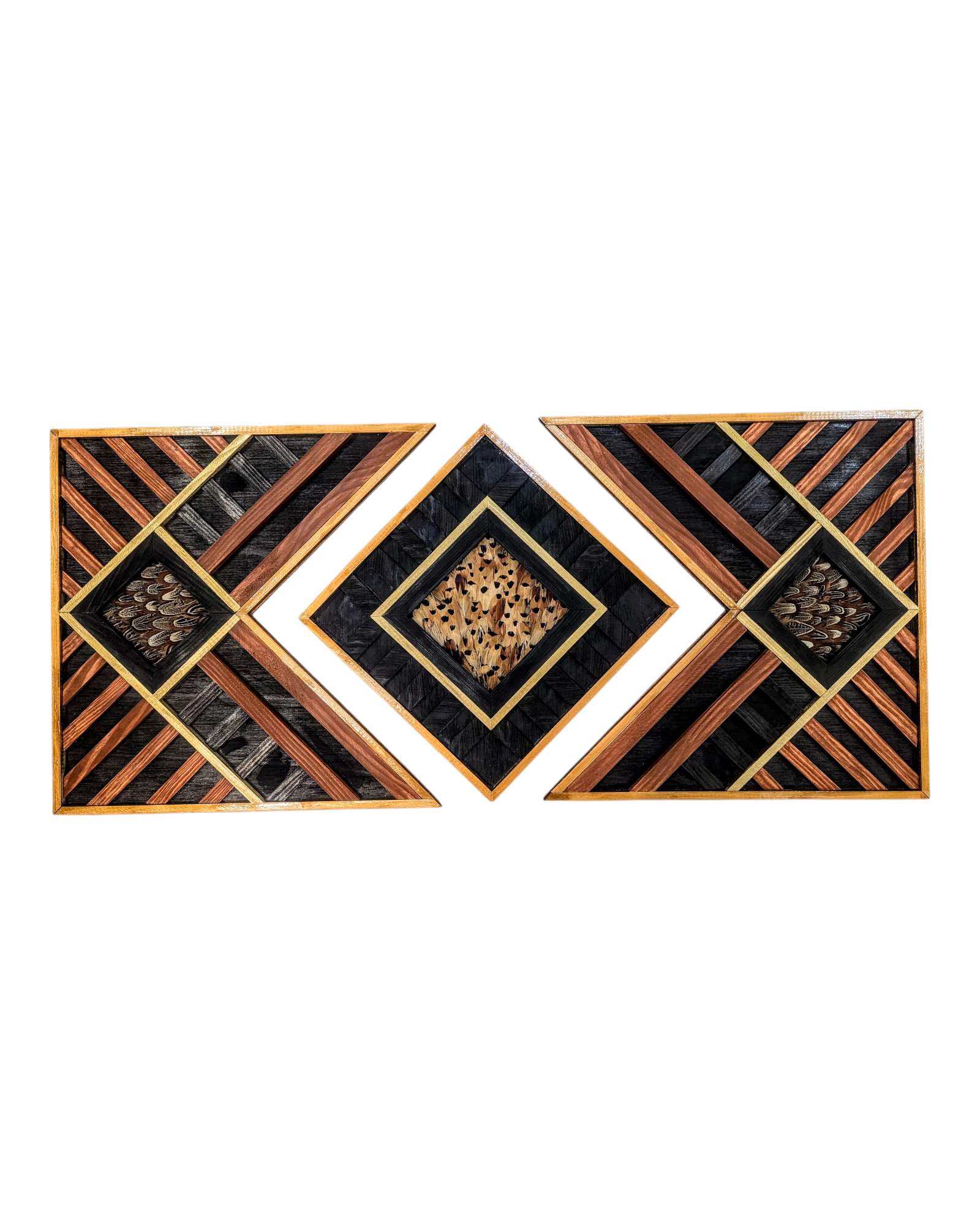 Cette œuvre combine des formes géométriques précises en bois avec des plumes de faisan véritables, intégrées à nu au cœur de la composition. L’agencement en losanges et chevrons crée un rythme visuel graphique, presque tribal, où chaque section est pensée comme un fragment de motif.