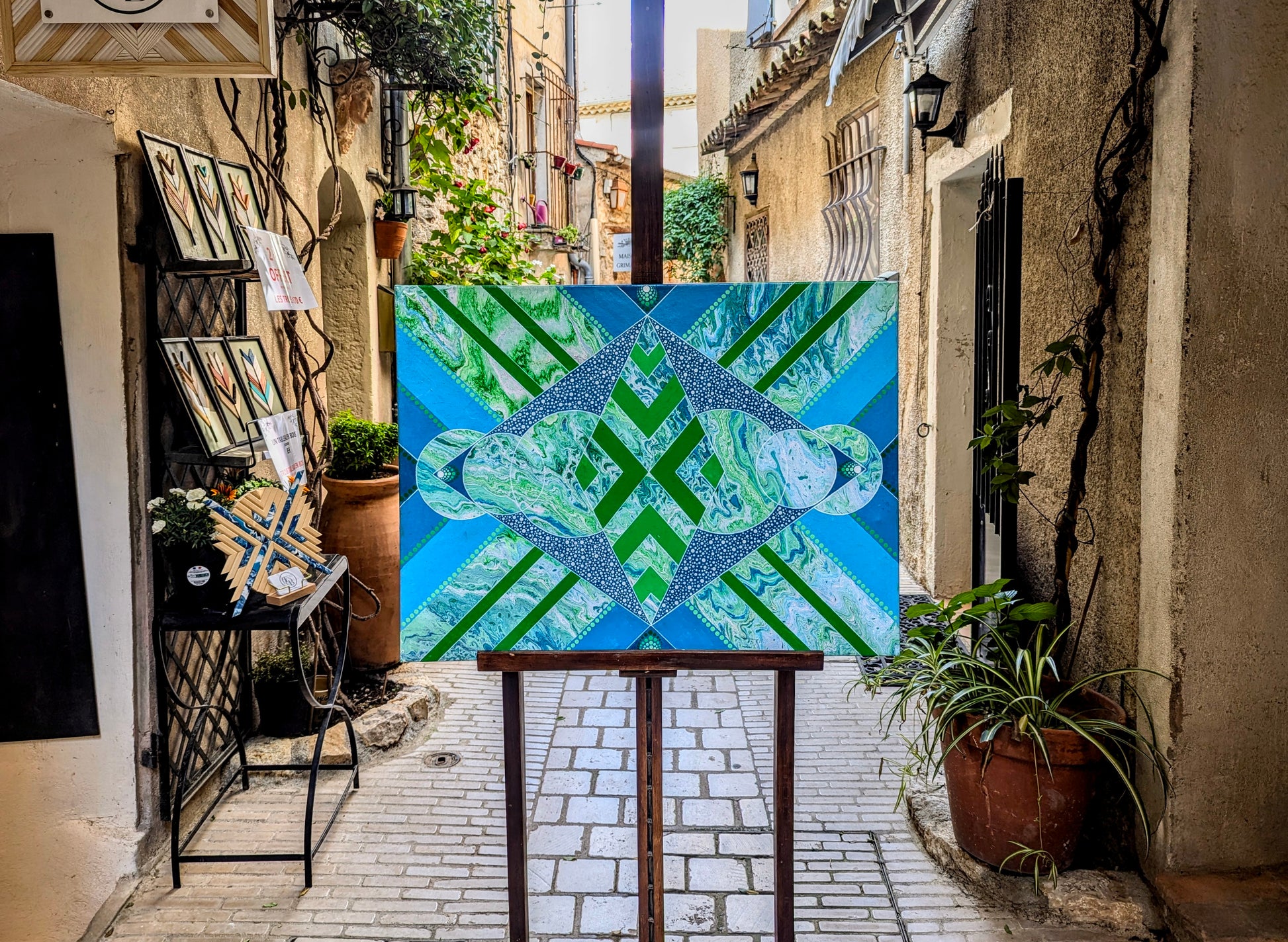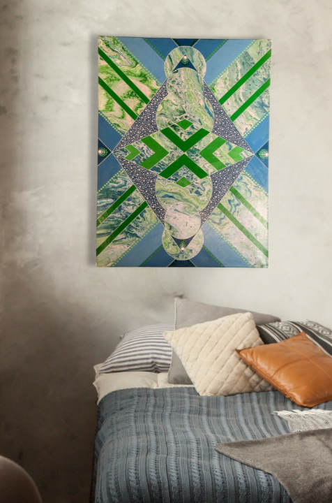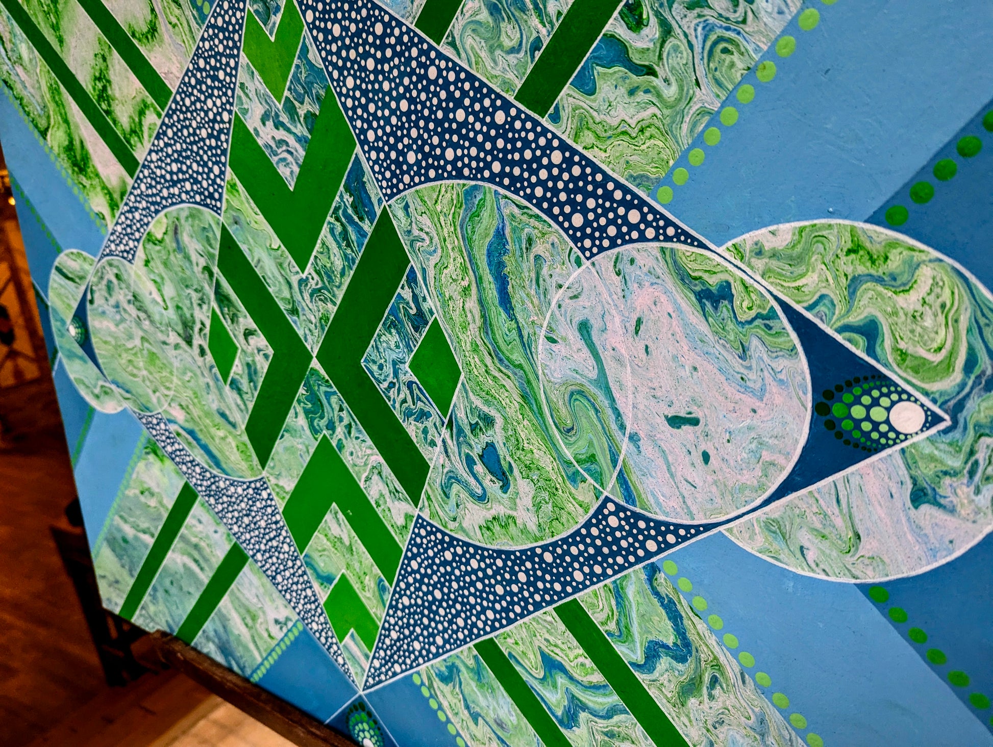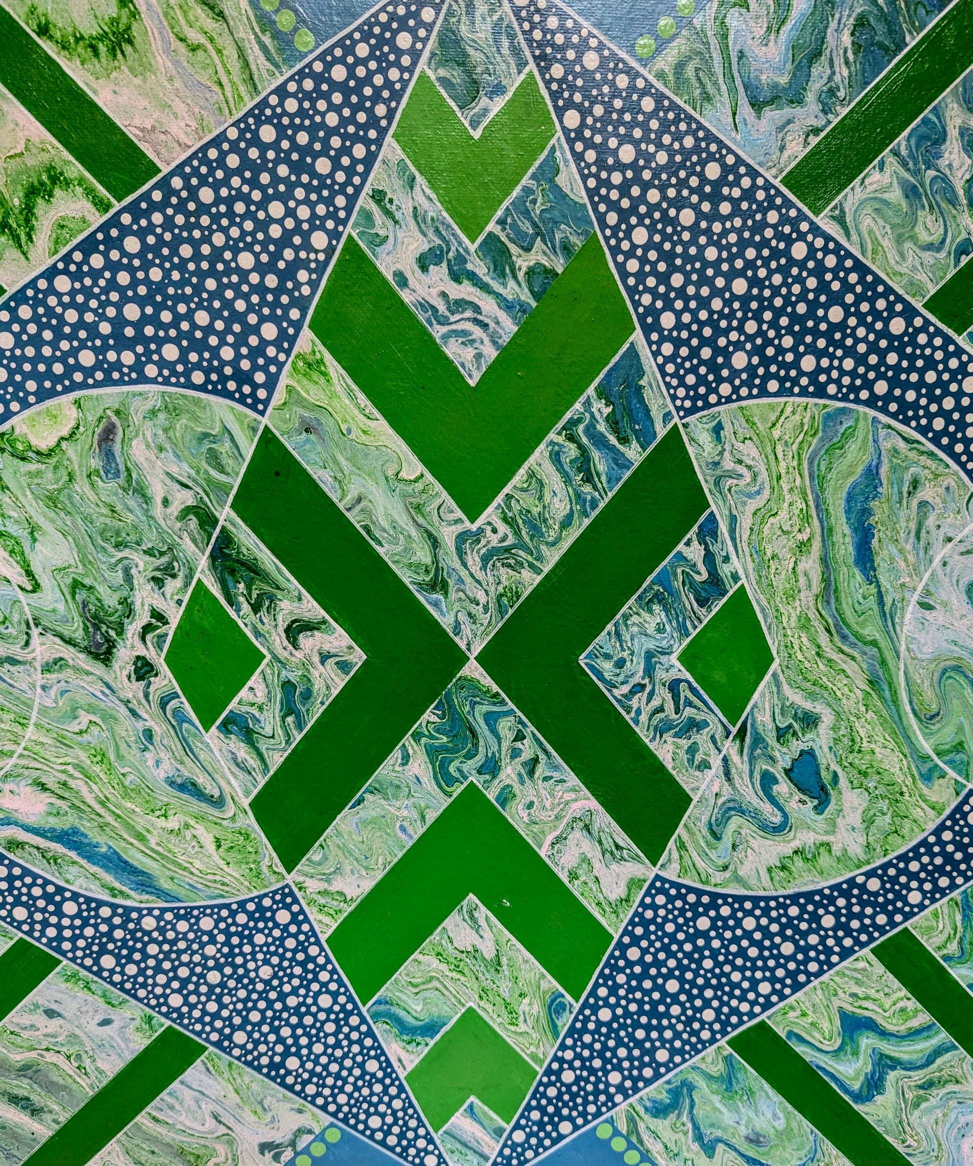 Cette œuvre vibrante explore la fusion entre les formes géométriques et les techniques fluides de l'acrylique pouring. Les couleurs bleu et vert, appliquées avec le coulage de l’acrylique, se mélangent de manière fluide et dynamique, créant un effet de profondeur et de mouvement. Les points blancs parsèment la composition, apportant une touche de lumière et d’animation à l'ensemble, tout en créant des contrastes visuels intéressants.