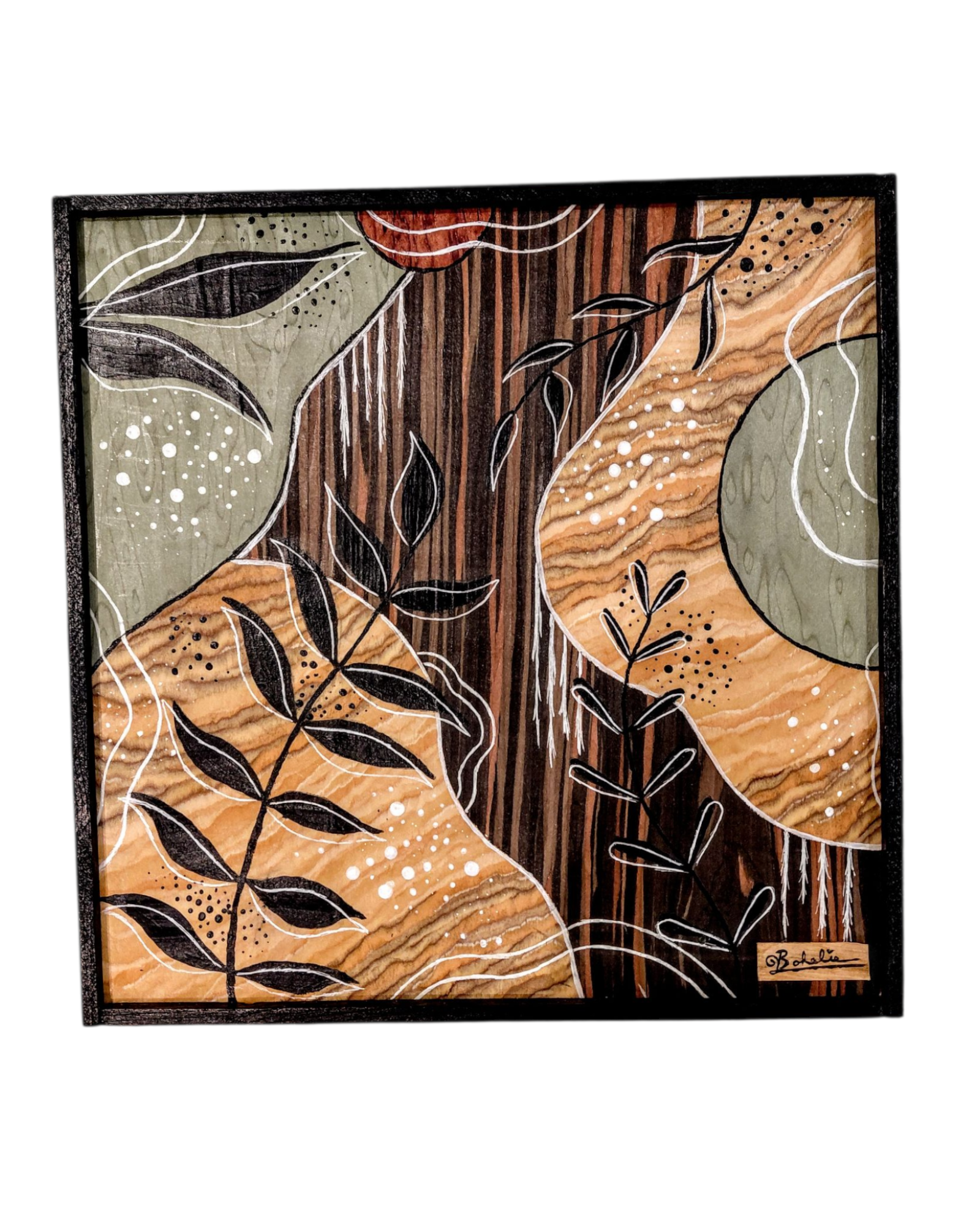 Ces œuvres carrées mêlent avec finesse la structure du bois et la liberté du trait peint. Chaque composition associe des essences de bois naturelles (en marqueterie) à des formes végétales stylisées, peintes à la main dans une palette douce : ocres, verts sauge, bruns profonds, noirs et blancs.