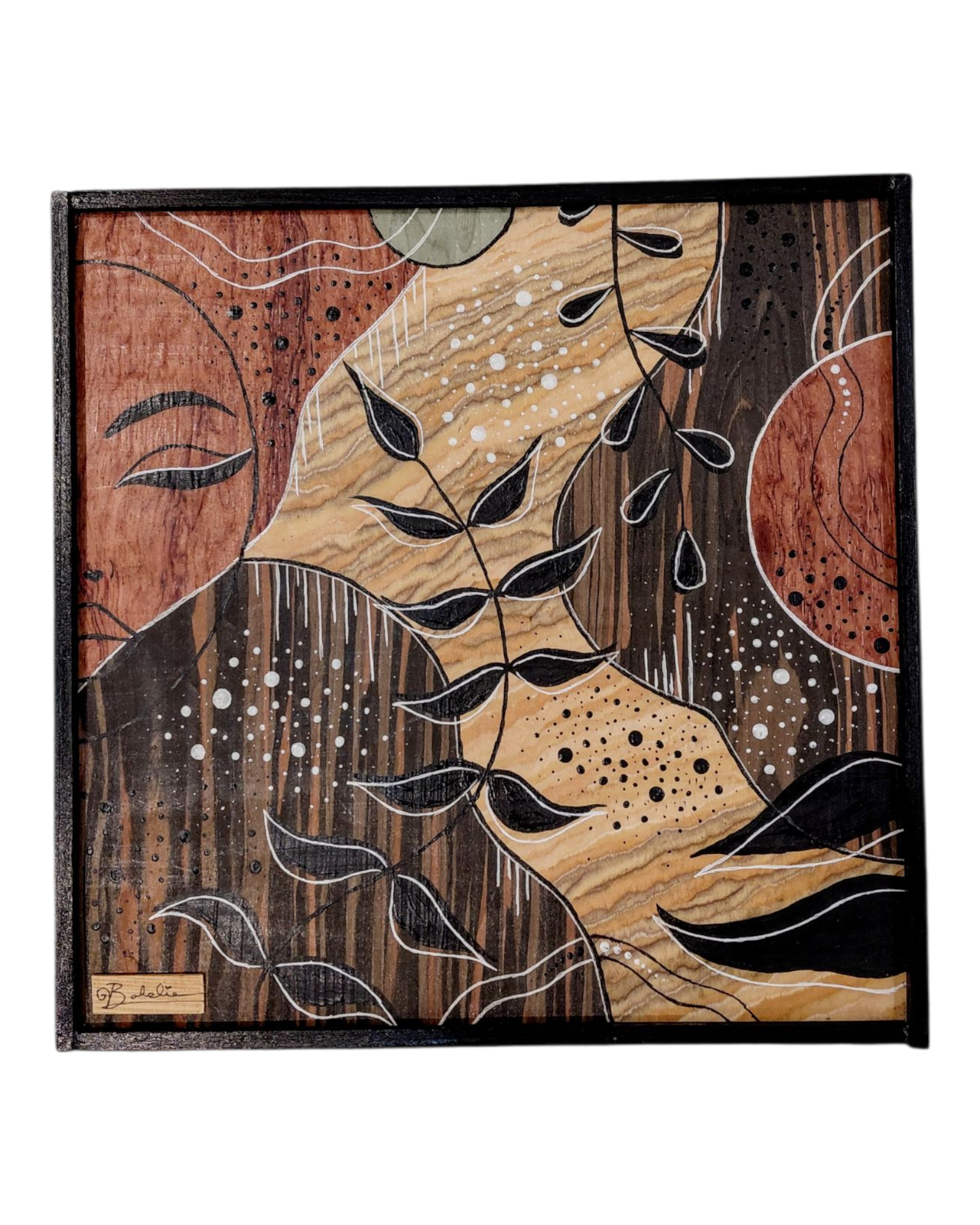 Ces œuvres carrées mêlent avec finesse la structure du bois et la liberté du trait peint. Chaque composition associe des essences de bois naturelles (en marqueterie) à des formes végétales stylisées, peintes à la main dans une palette douce : ocres, verts sauge, bruns profonds, noirs et blancs.