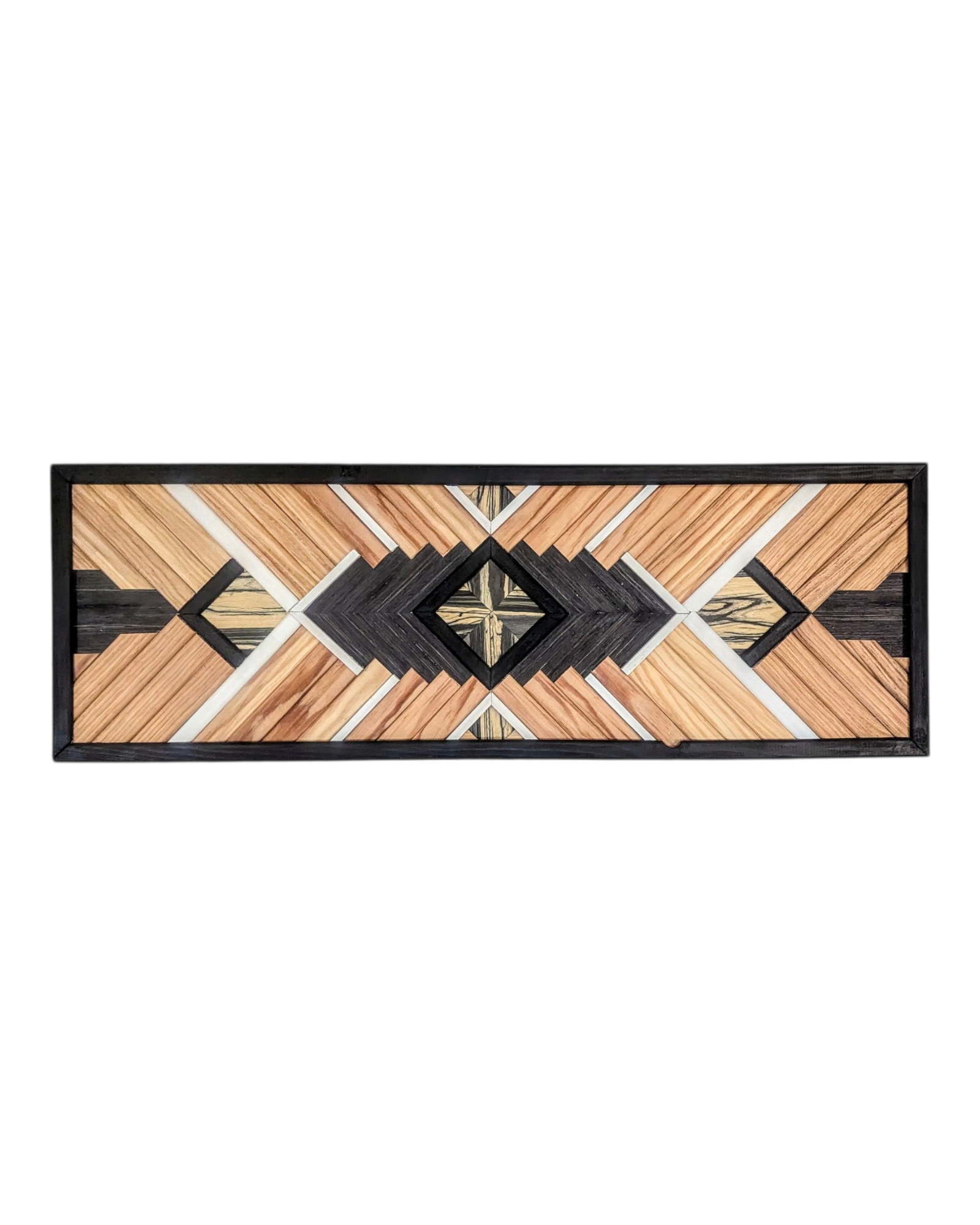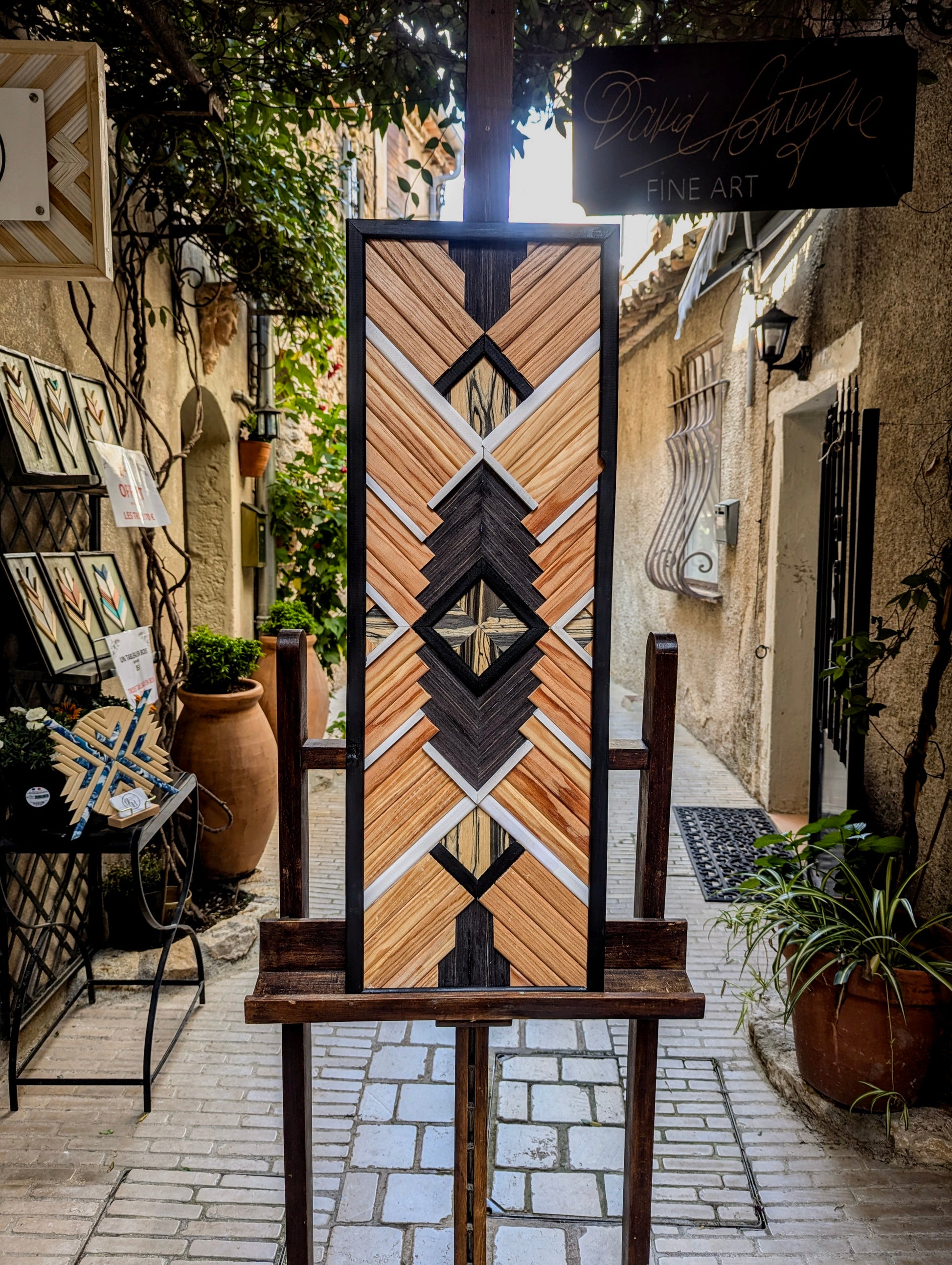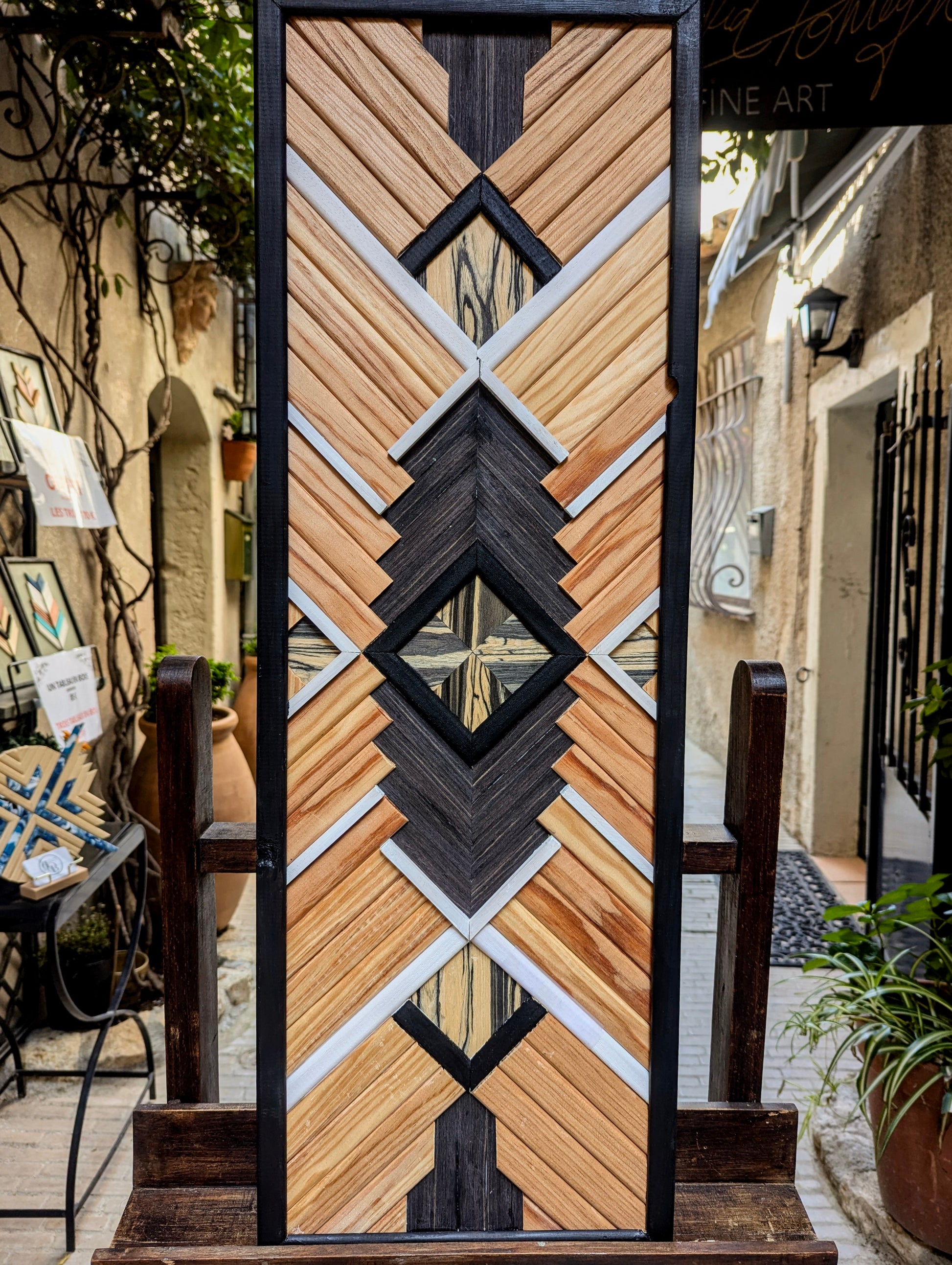 Cette œuvre unique fusionne l’élégance du bois naturel et la rigueur des formes géométriques pour créer une pièce moderne et audacieuse. L’artisanat se mêle à la géométrie dans un jeu de lignes nettes et de textures variées. Le mélange des tasseaux de pin et d’ayou génère une harmonie légère, tandis que les placages de bois Zebrano et Ébène apportent une profondeur et une sophistication incontestables, avec leurs veinures distinctes qui captivent le regard.