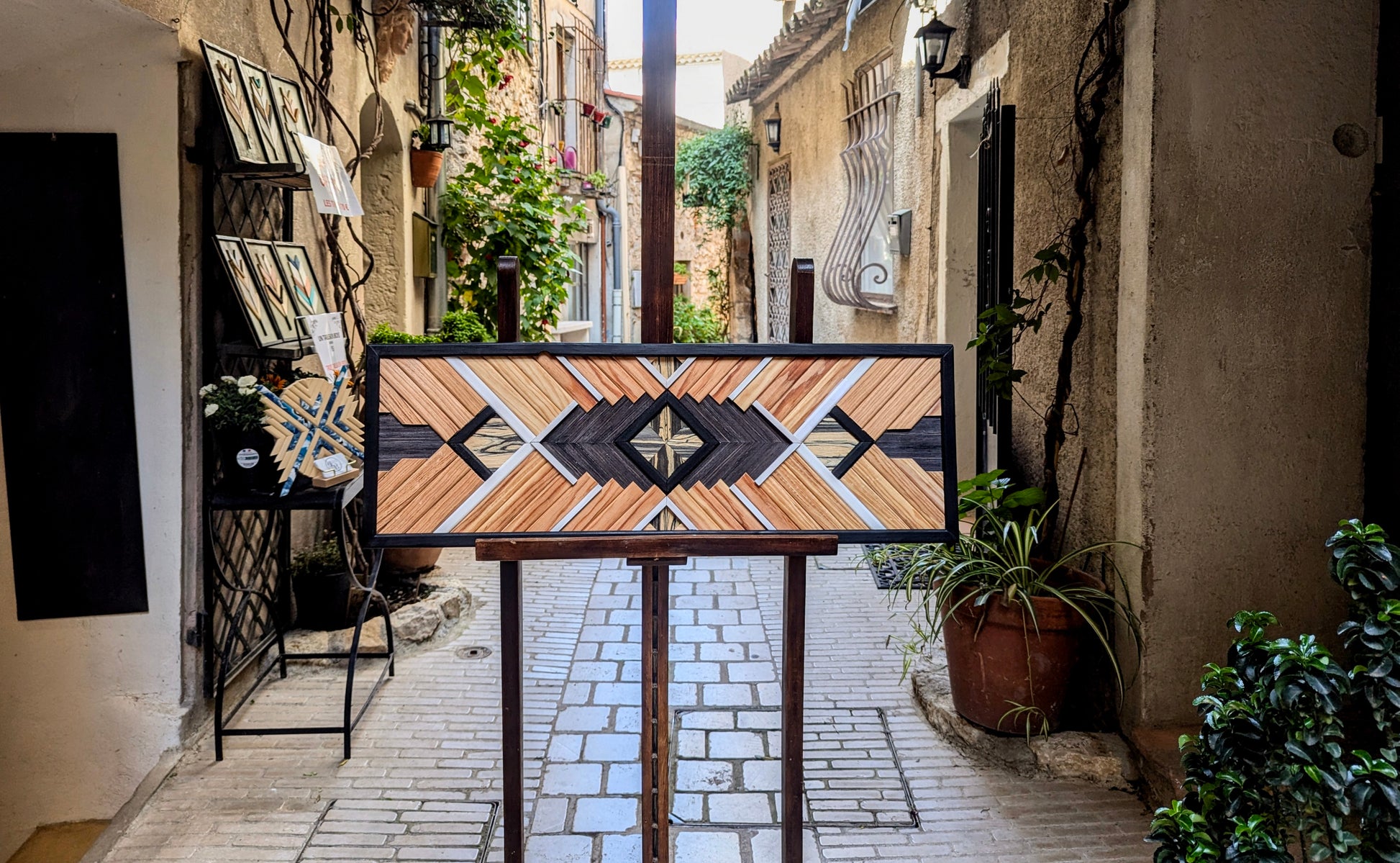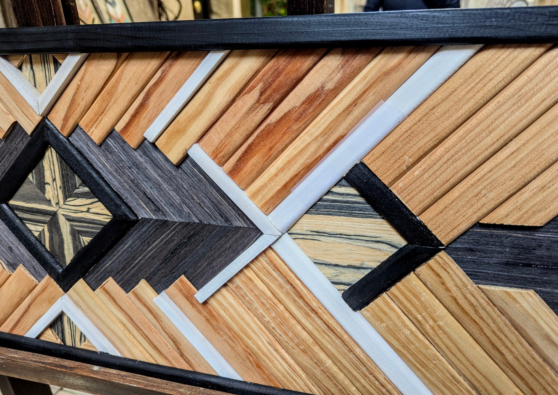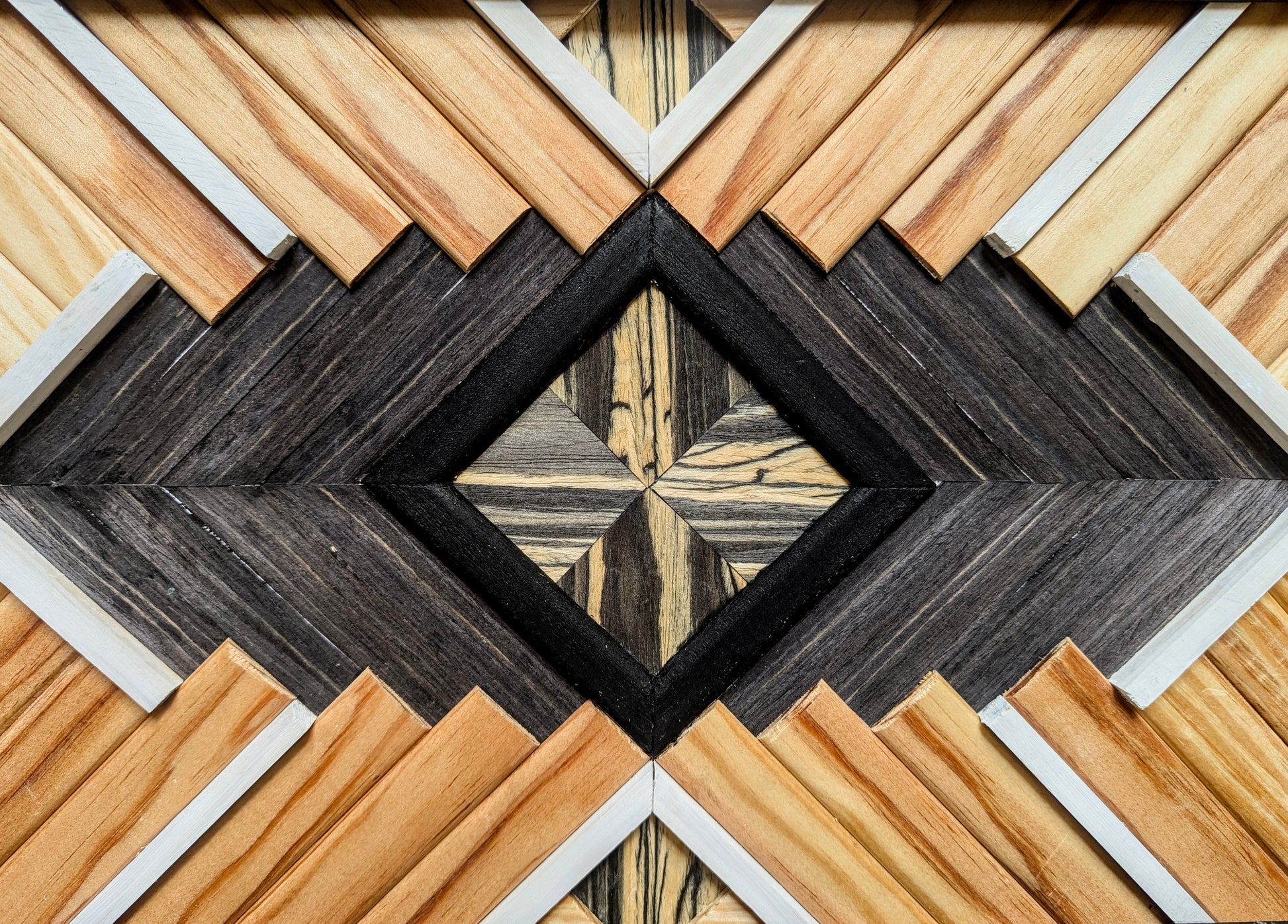 Cette œuvre unique fusionne l’élégance du bois naturel et la rigueur des formes géométriques pour créer une pièce moderne et audacieuse. L’artisanat se mêle à la géométrie dans un jeu de lignes nettes et de textures variées. Le mélange des tasseaux de pin et d’ayou génère une harmonie légère, tandis que les placages de bois Zebrano et Ébène apportent une profondeur et une sophistication incontestables, avec leurs veinures distinctes qui captivent le regard.
