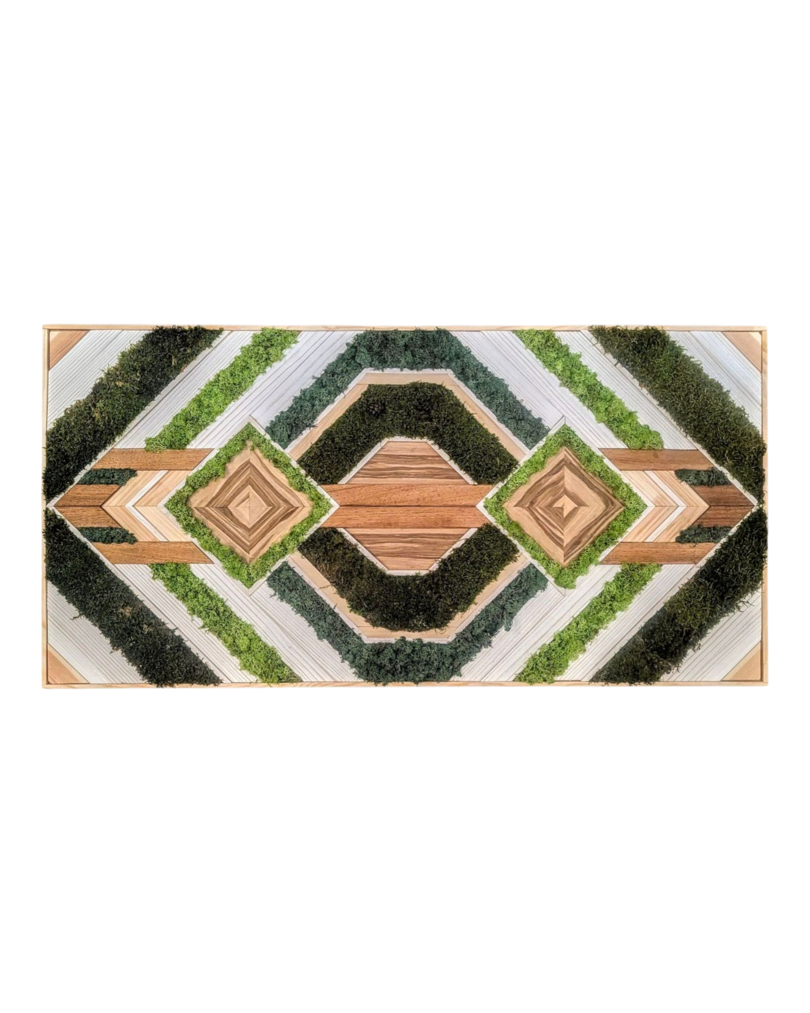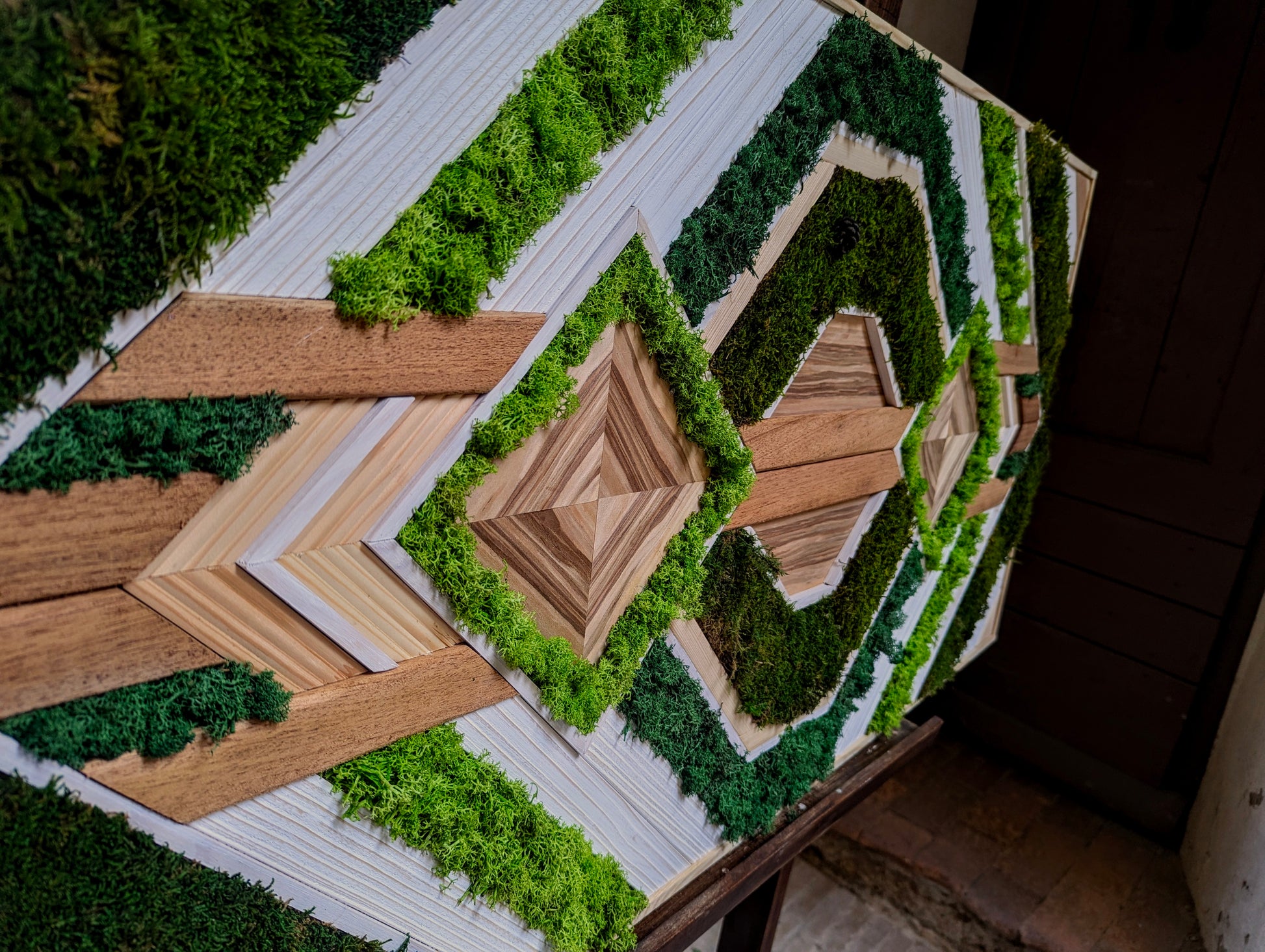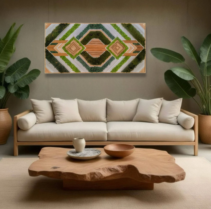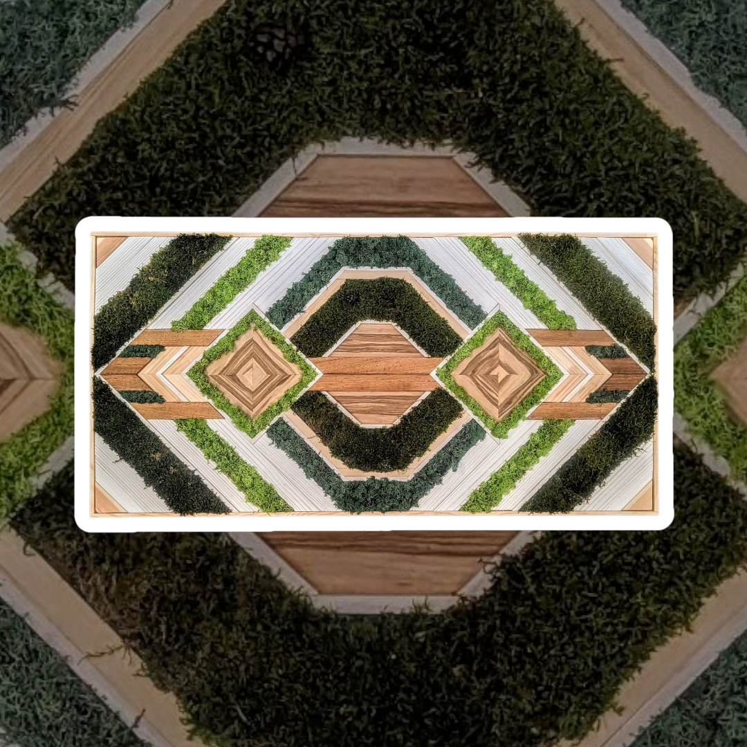 Cette œuvre riche en textures et en contrastes met en valeur une fusion harmonieuse entre le bois et la nature. Les tasseaux de chêne et de pin, aux teintes chaleureuses et profondes, sont combinés avec un placage de pomme, apportant une touche de douceur et de fraîcheur. Les éléments végétaux, sous forme de mousse végétale stabilisée, sont disposés de manière créative, ajoutant une dimension organique et vivante à l’ensemble. La mousse, dont la texture délicate et la couleur verdoyante s’harmonisent avec le bois, introduit un élément de fraîcheur et de naturalité, contrastant avec la solidité des matériaux boisés.