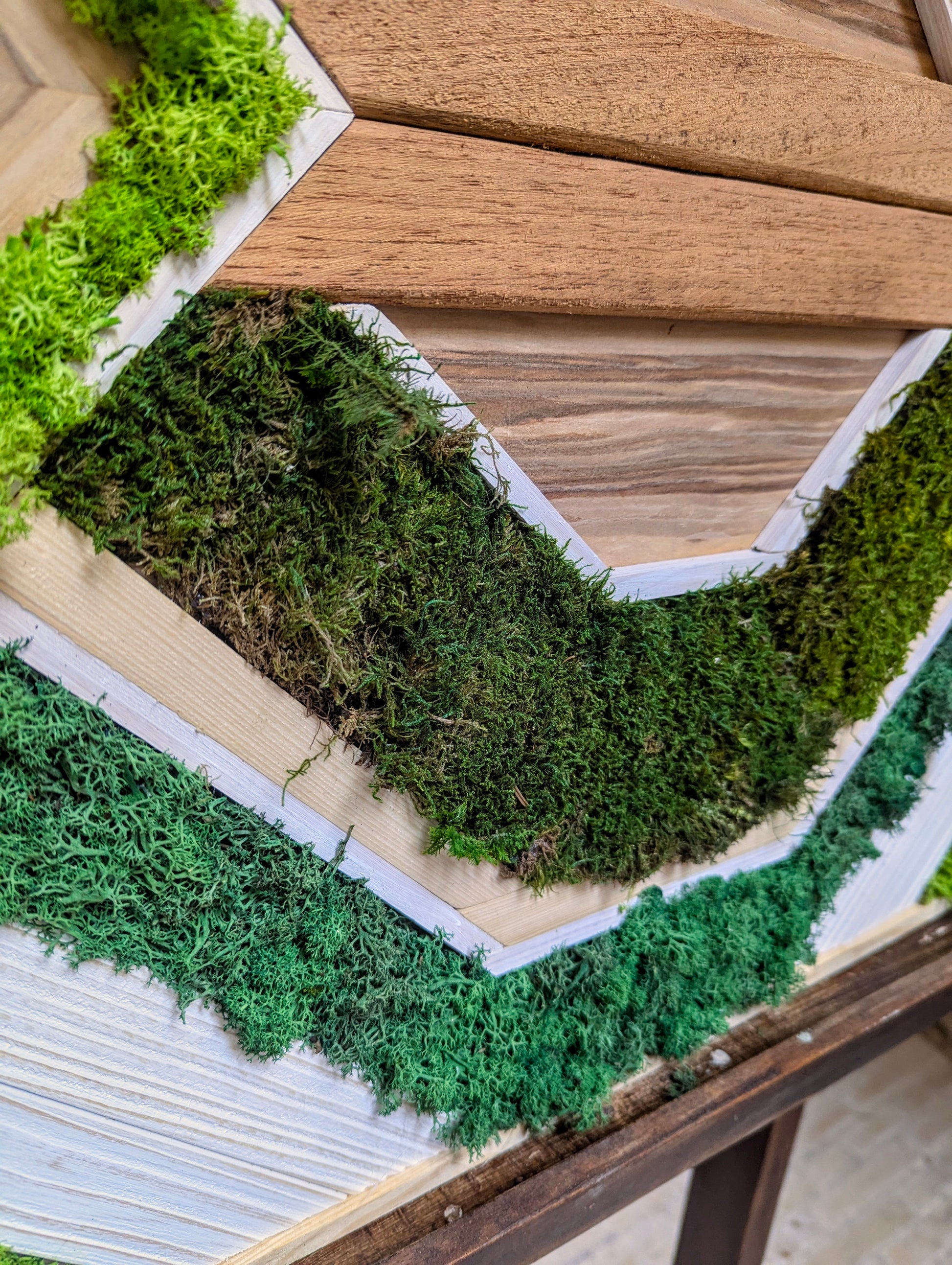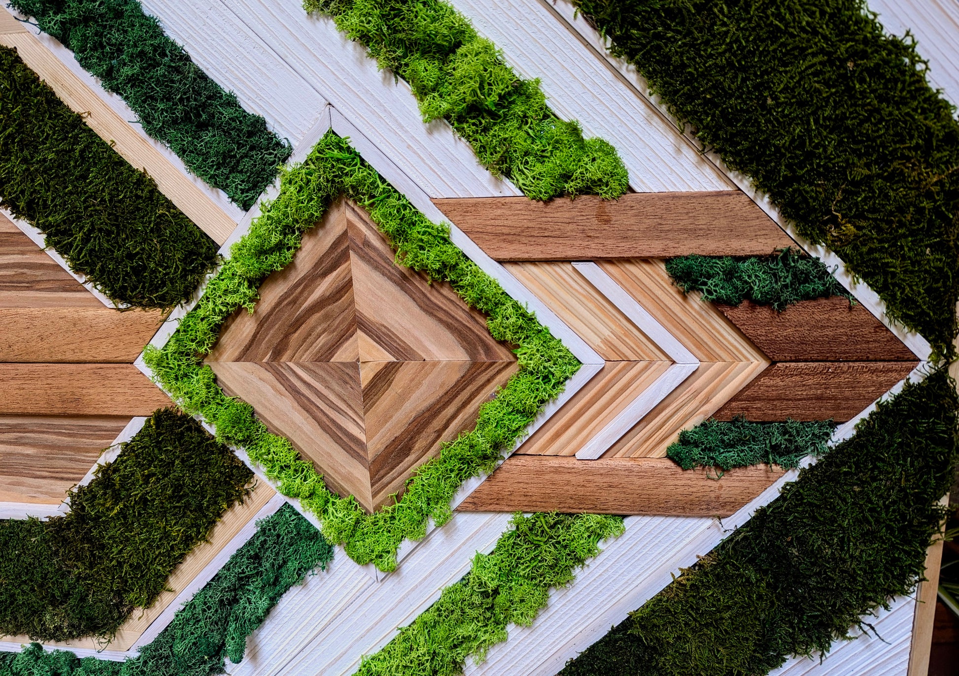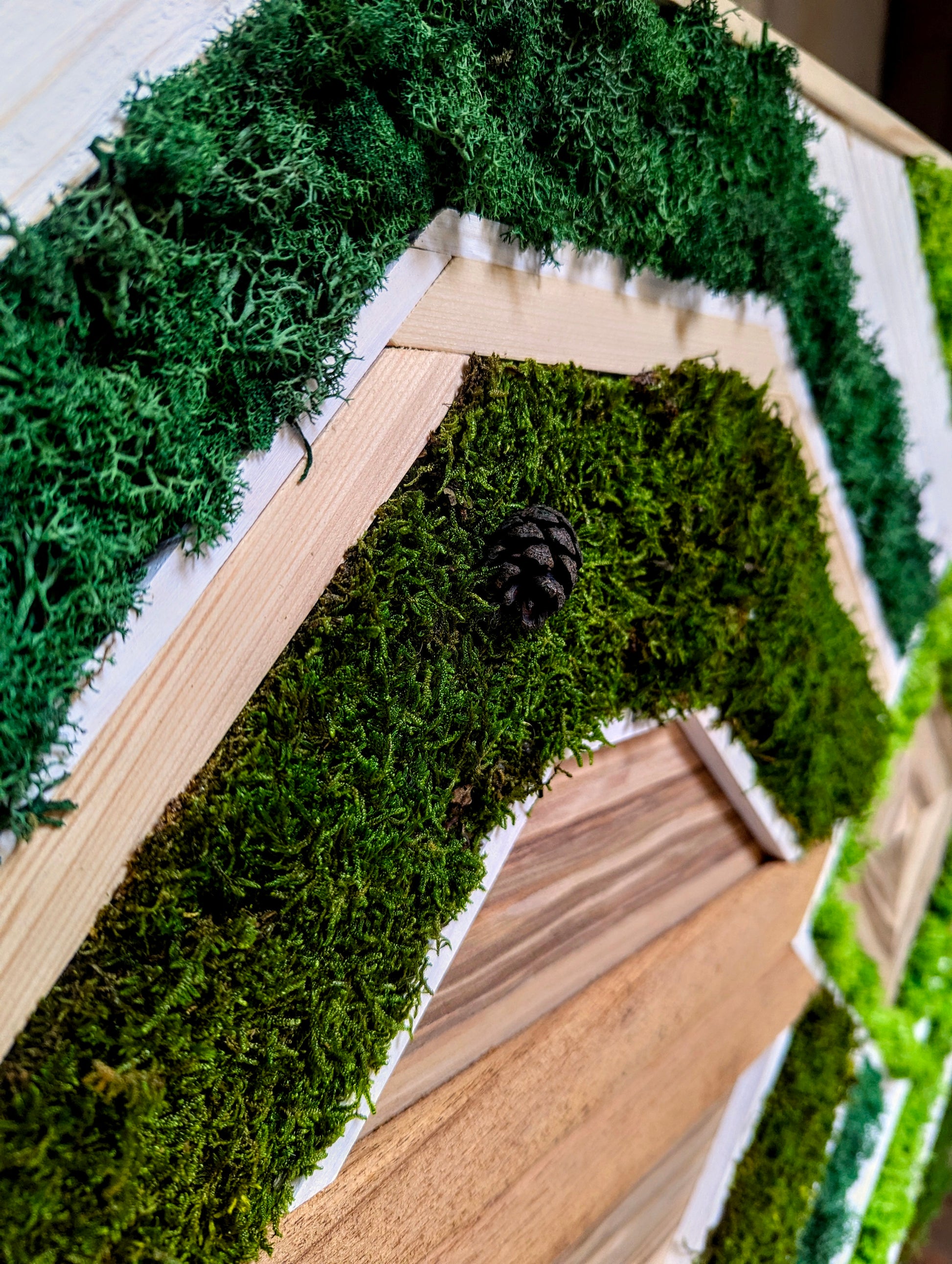 Cette œuvre riche en textures et en contrastes met en valeur une fusion harmonieuse entre le bois et la nature. Les tasseaux de chêne et de pin, aux teintes chaleureuses et profondes, sont combinés avec un placage de pomme, apportant une touche de douceur et de fraîcheur. Les éléments végétaux, sous forme de mousse végétale stabilisée, sont disposés de manière créative, ajoutant une dimension organique et vivante à l’ensemble. La mousse, dont la texture délicate et la couleur verdoyante s’harmonisent avec le bois, introduit un élément de fraîcheur et de naturalité, contrastant avec la solidité des matériaux boisés.