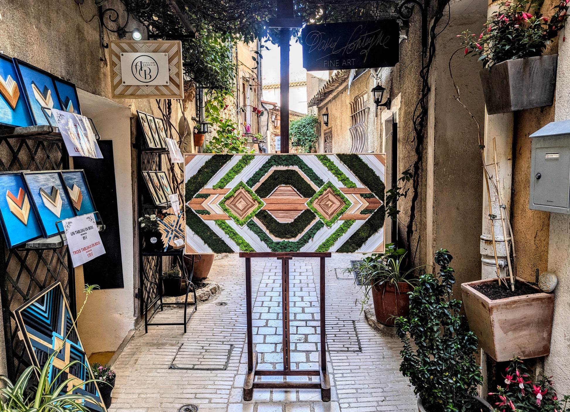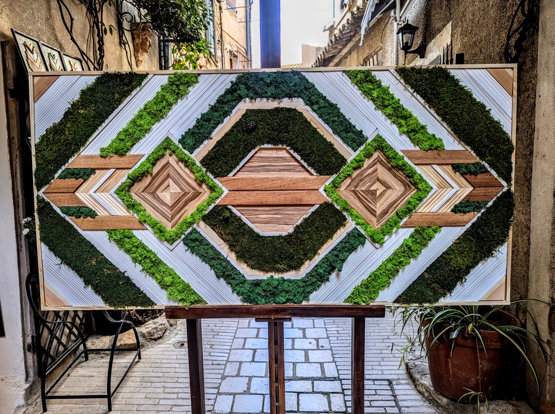 Cette œuvre, placée sur contreplaqué, offre une grande stabilité tout en étant un véritable lien entre l'art et la nature. Elle invite à la contemplation et apporte une touche de verdure et d'authenticité à tout espace, qu’il soit moderne ou plus traditionnel.