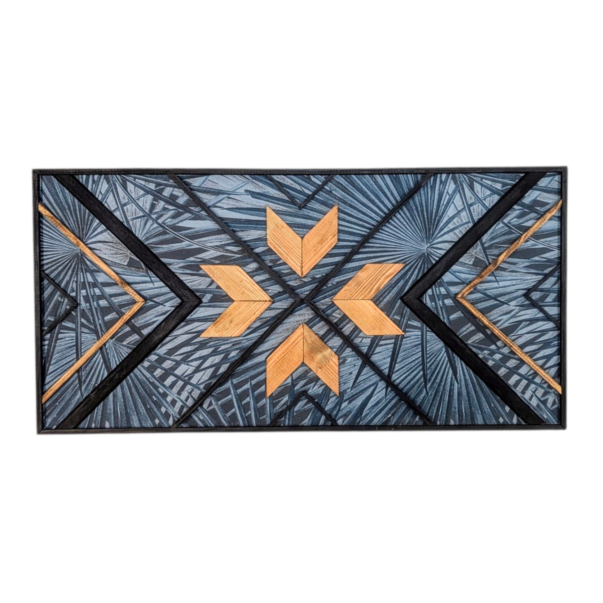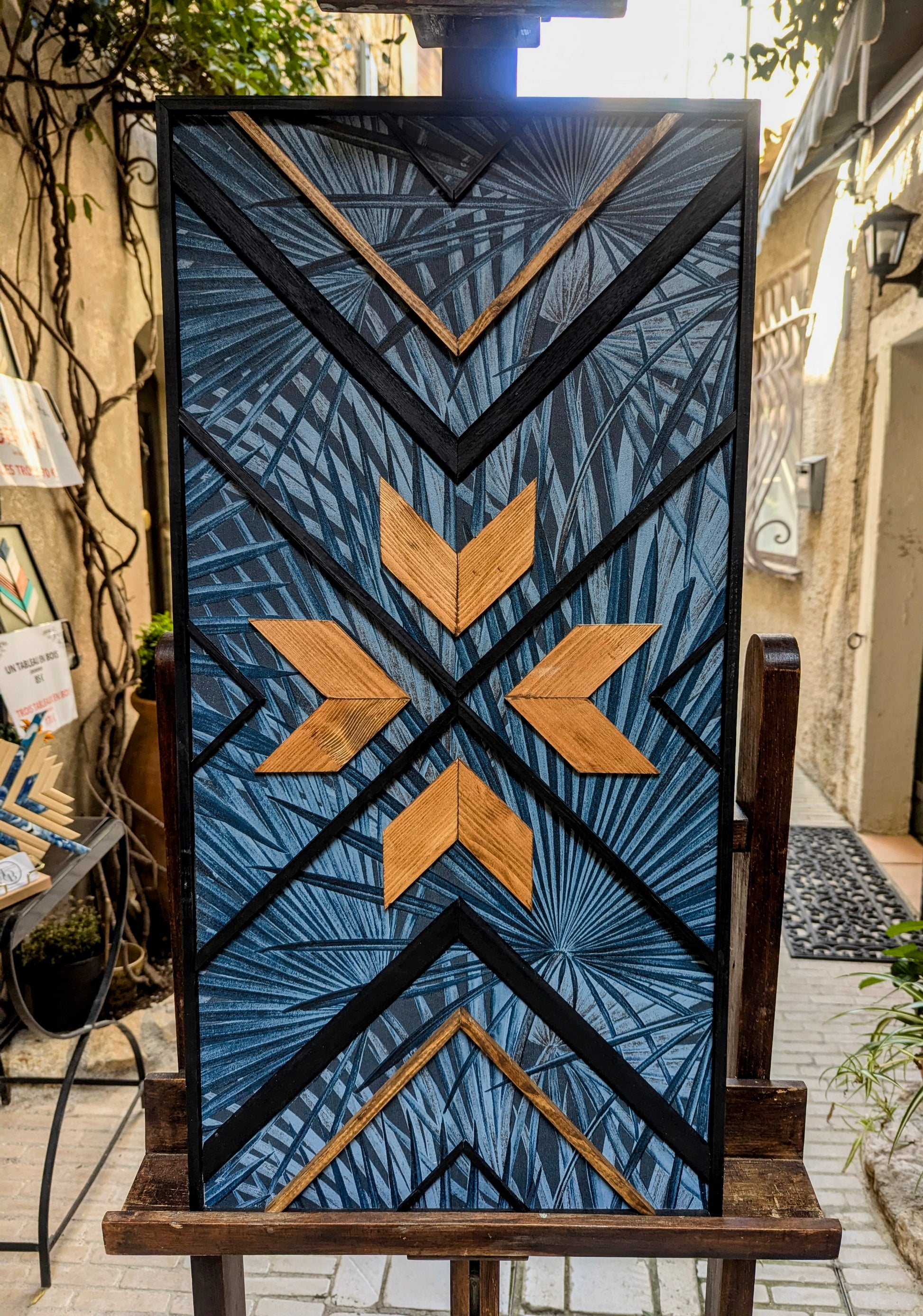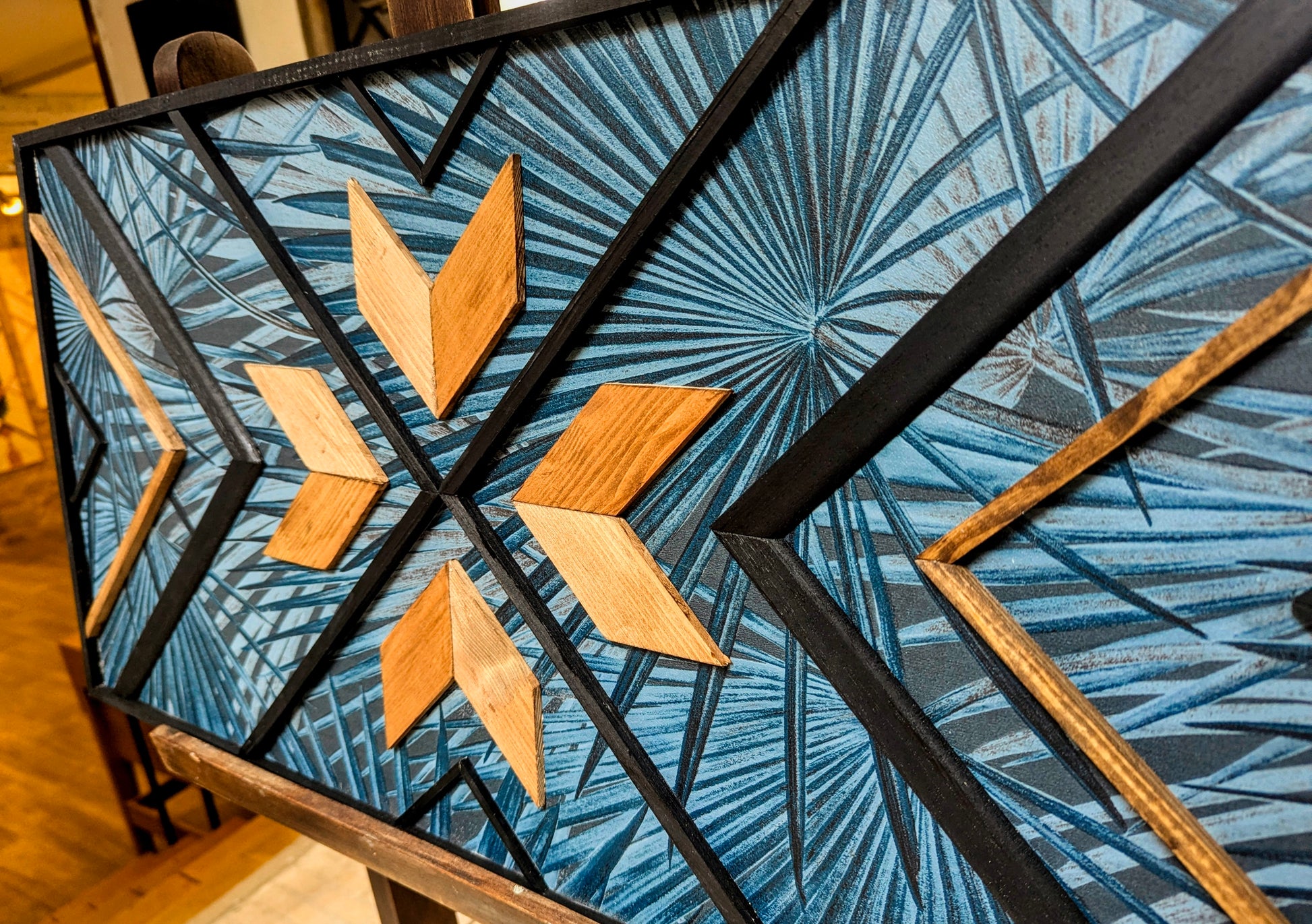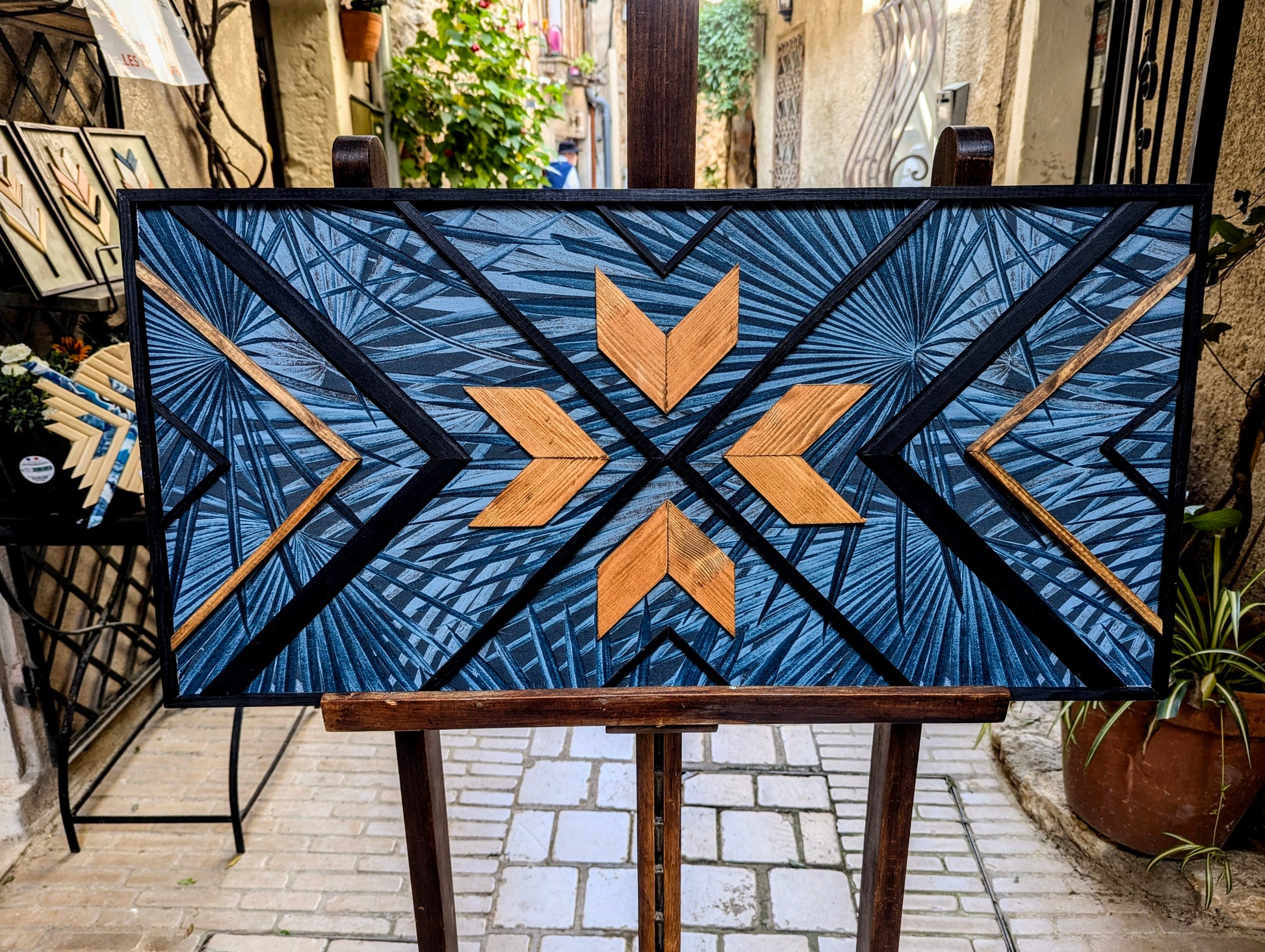 Dans cette œuvre au format allongé, le fond bleu à motif végétal s’efface en douceur derrière une composition boisée plus épurée. Tasseaux de pin, de chêne ou d’ayous s’organisent en rythmes calmes, soulignant la texture et la chaleur du bois sans trop en dire.