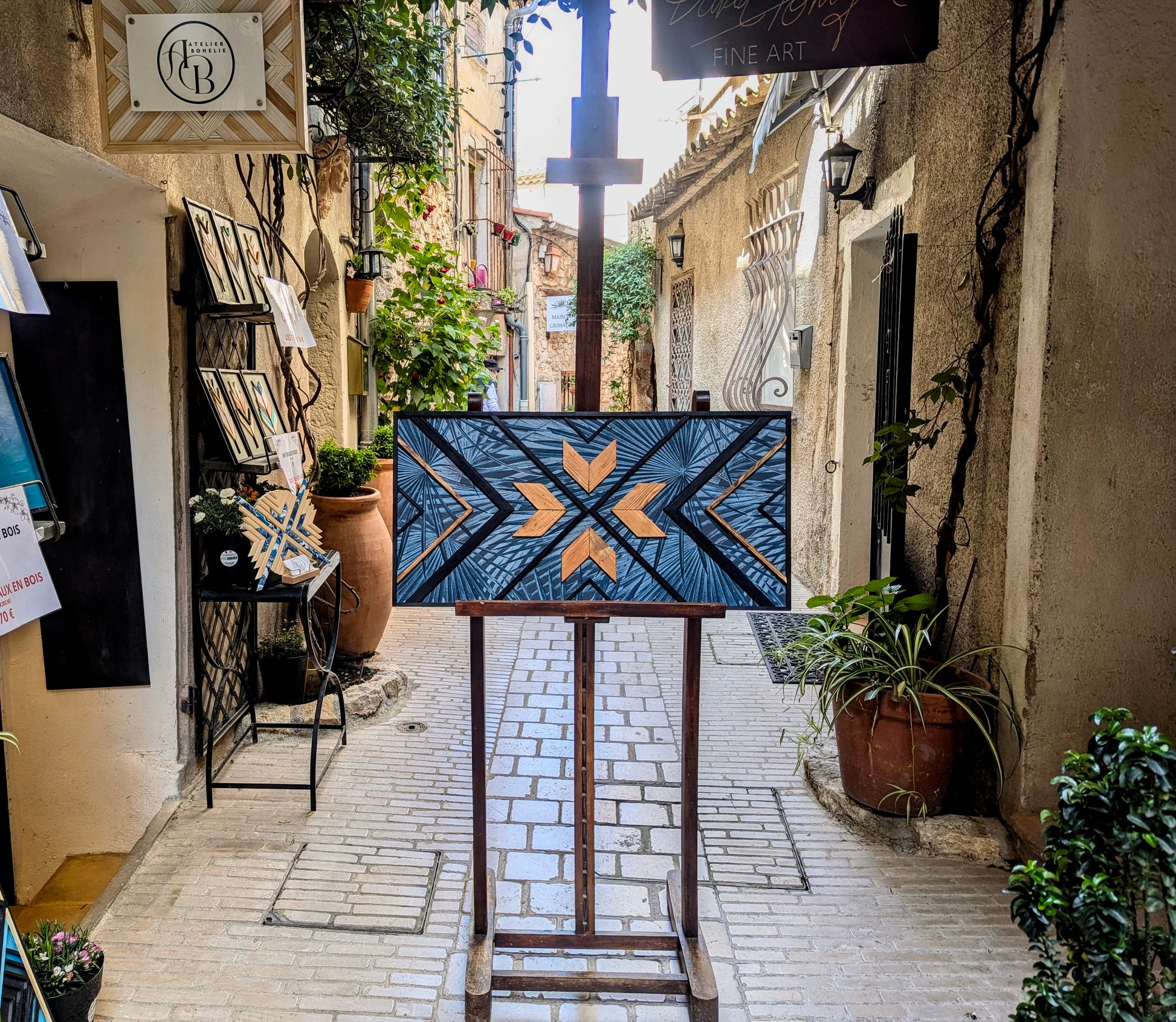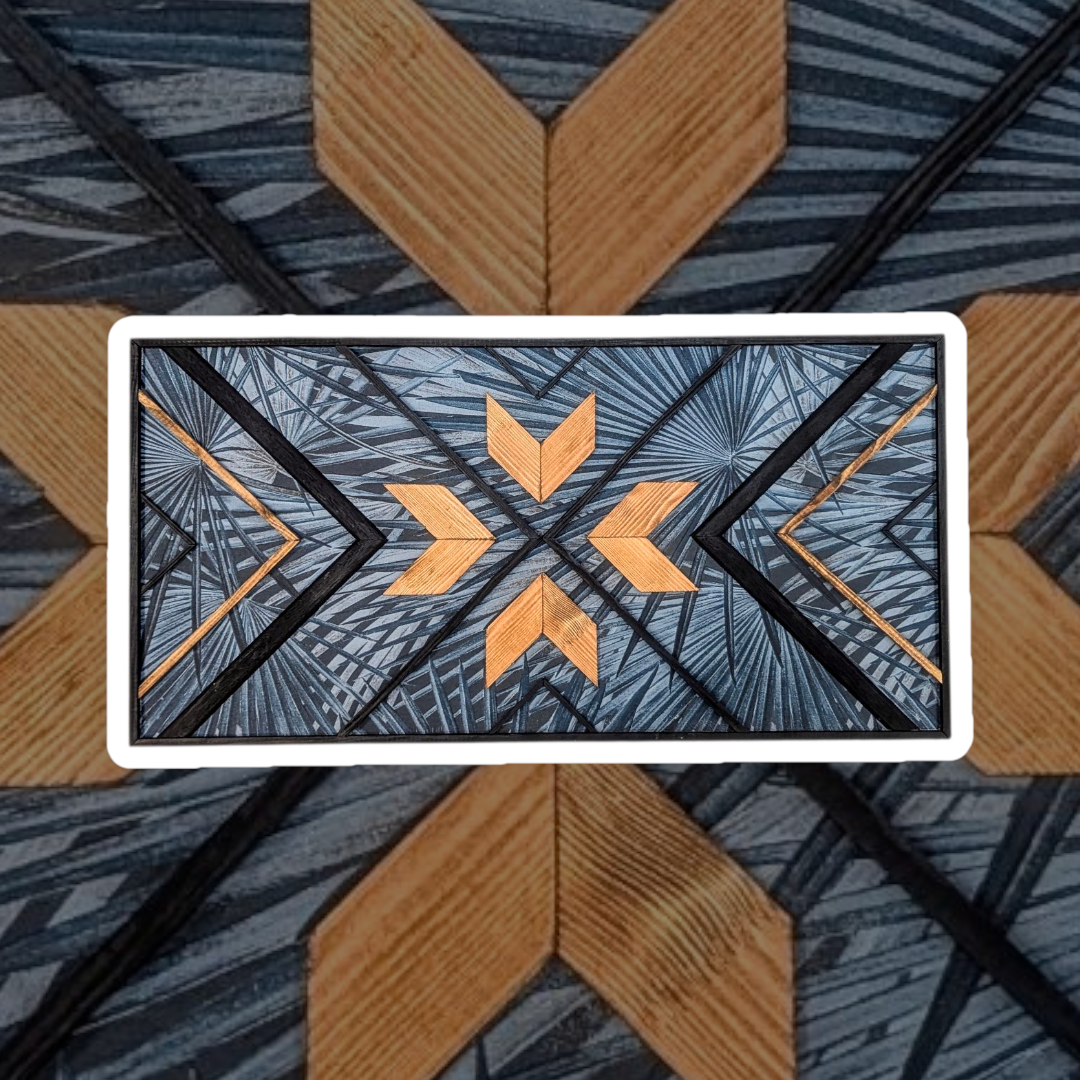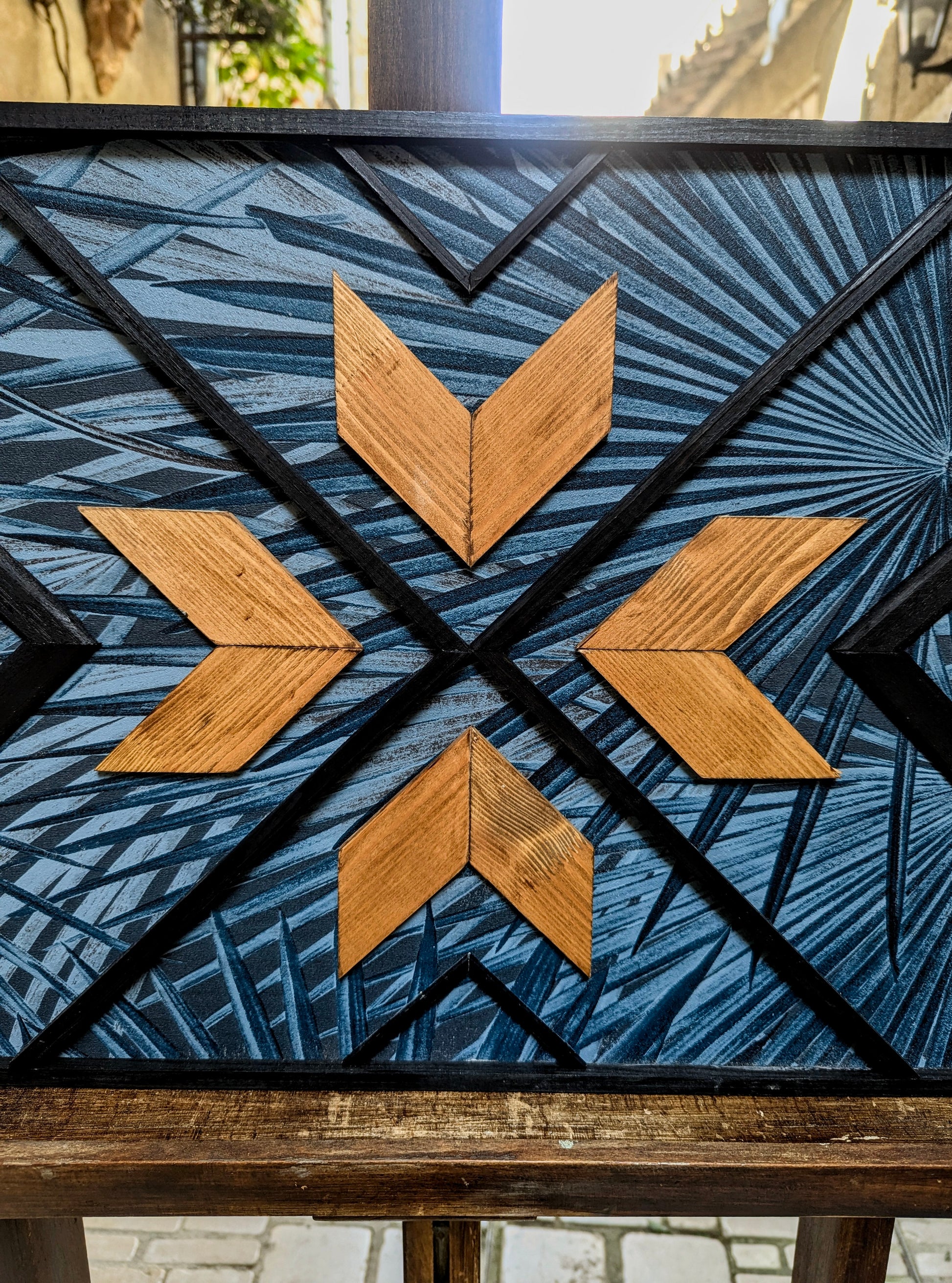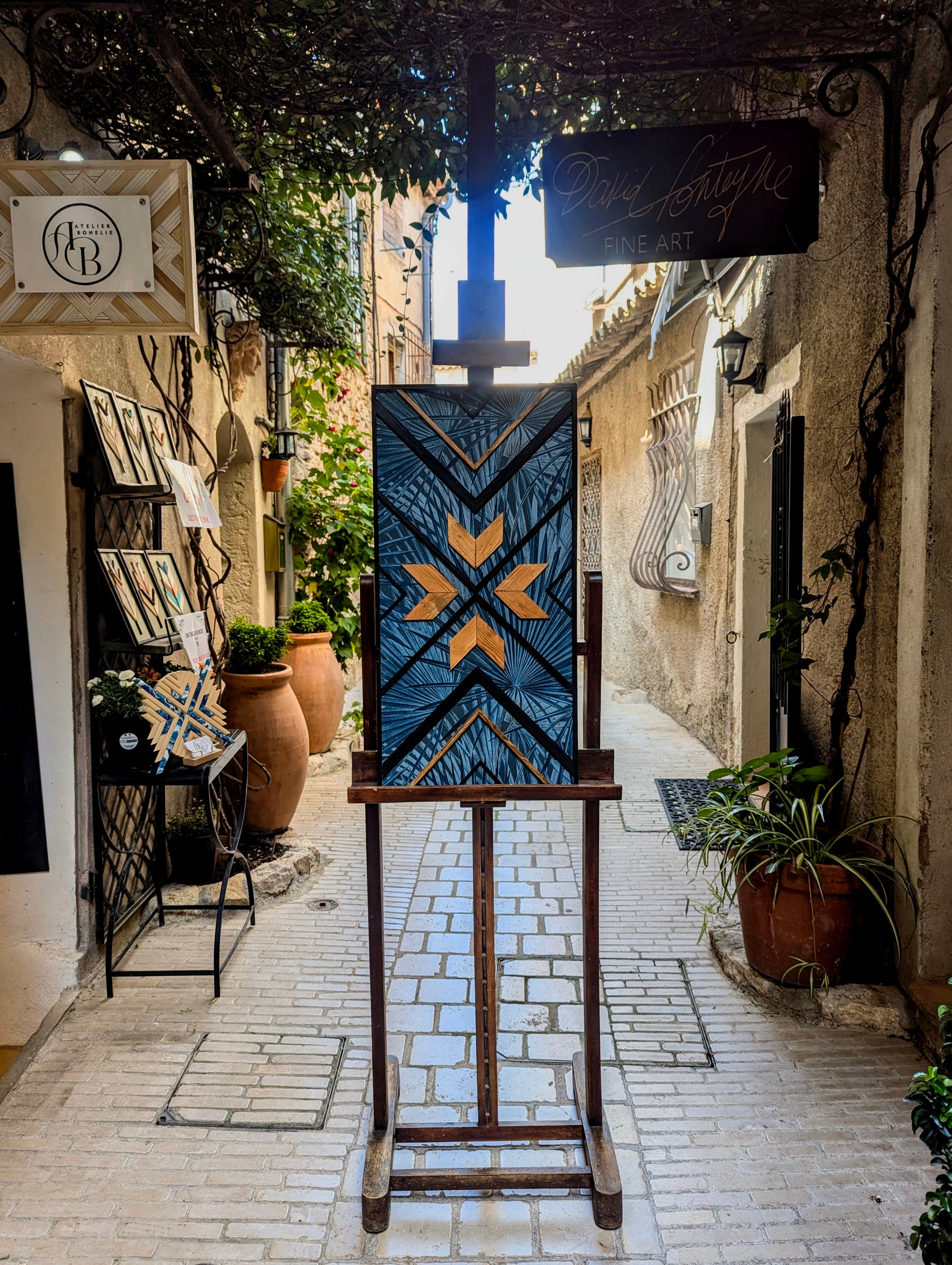 Dans cette œuvre au format allongé, le fond bleu à motif végétal s’efface en douceur derrière une composition boisée plus épurée. Tasseaux de pin, de chêne ou d’ayous s’organisent en rythmes calmes, soulignant la texture et la chaleur du bois sans trop en dire.