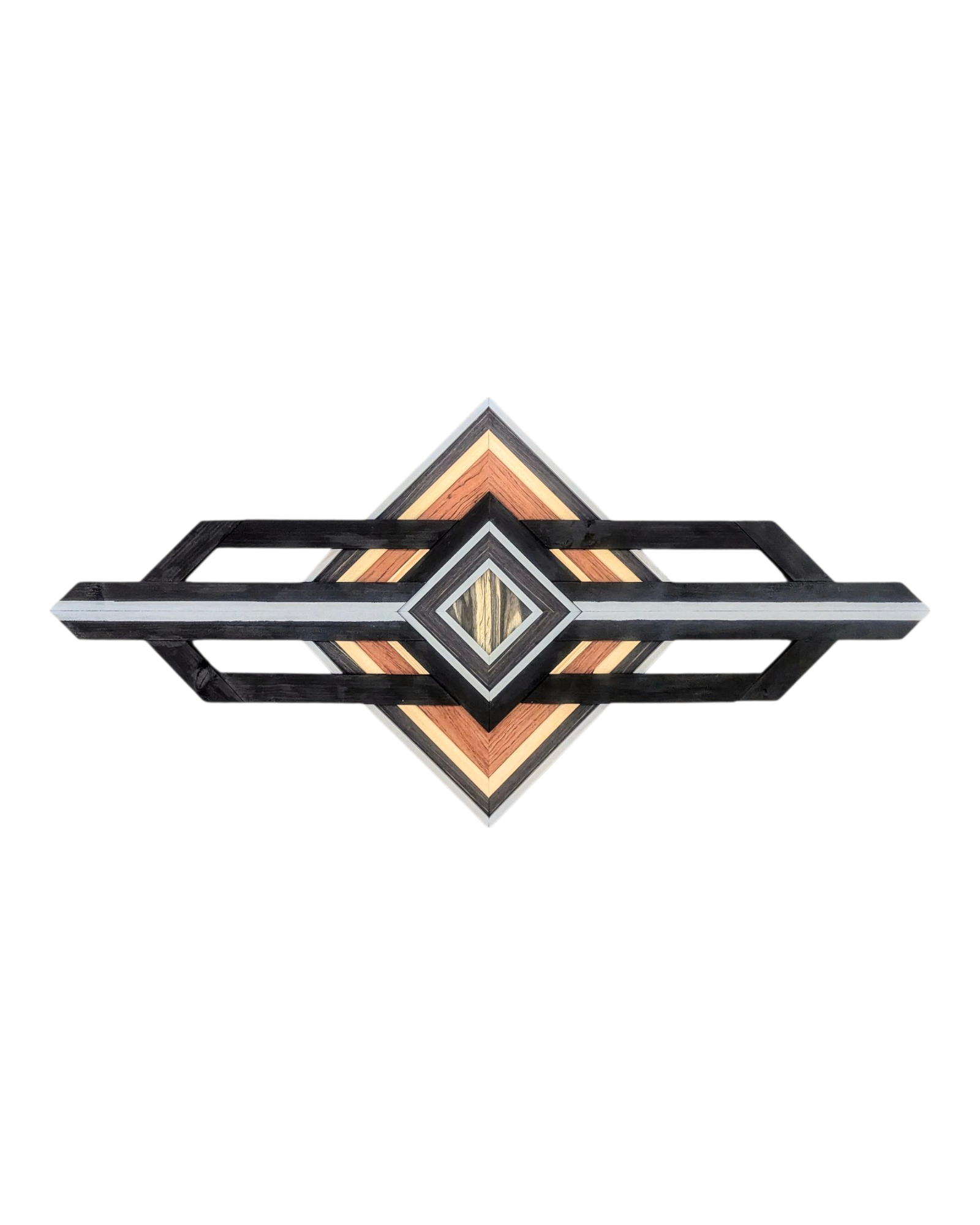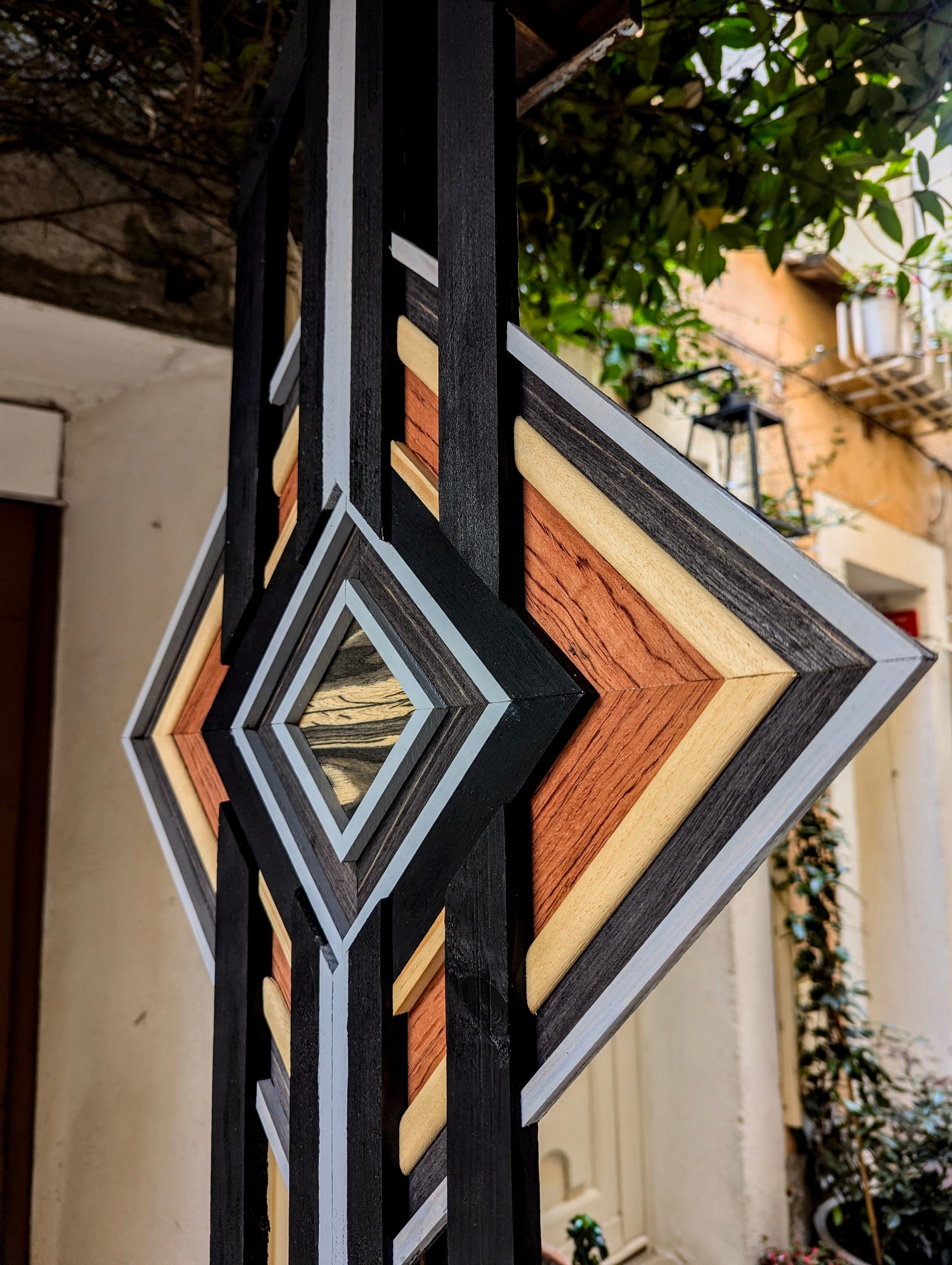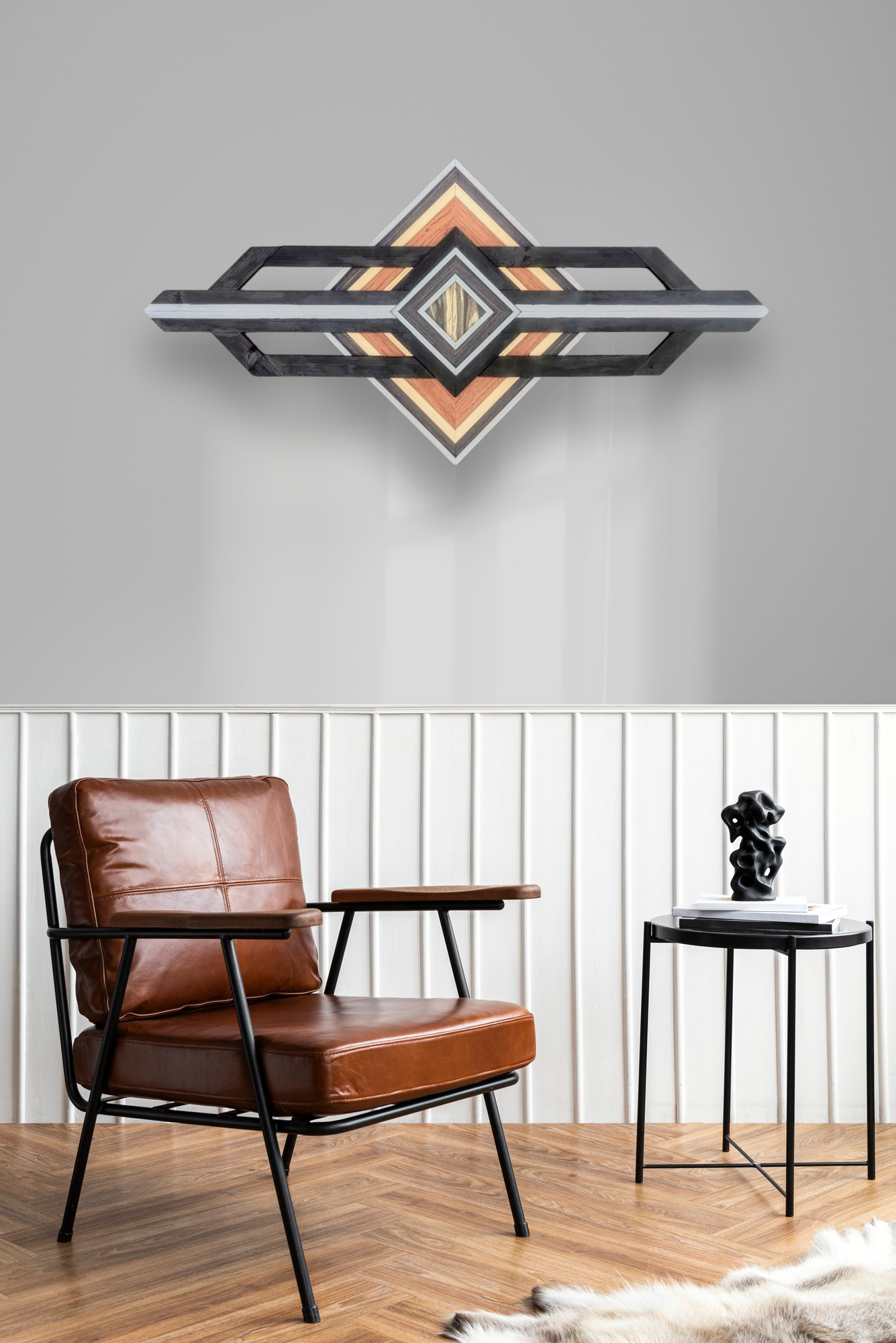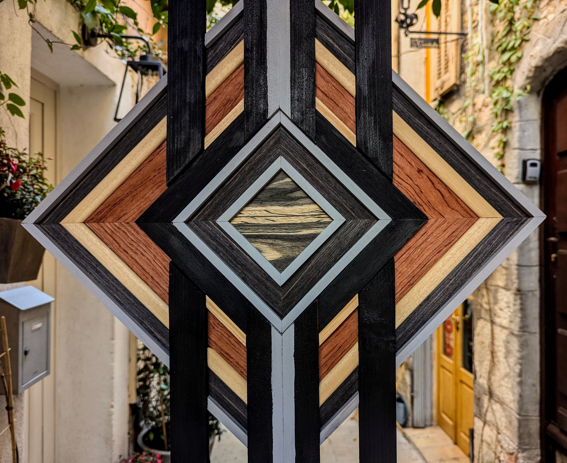 Cette œuvre contemporaine et audacieuse joue avec la forme carrée et l’interaction entre le cadre et l’espace environnant. Les tasseaux de bois, soigneusement disposés, semblent s'échapper du cadre, donnant une impression de mouvement et d'extension, tout en créant une dynamique visuelle unique. Le placage de Zebrano, avec ses veines marquées et son contraste saisissant entre les tonalités claires et sombres, apporte une richesse visuelle et texturale à l’ensemble.
