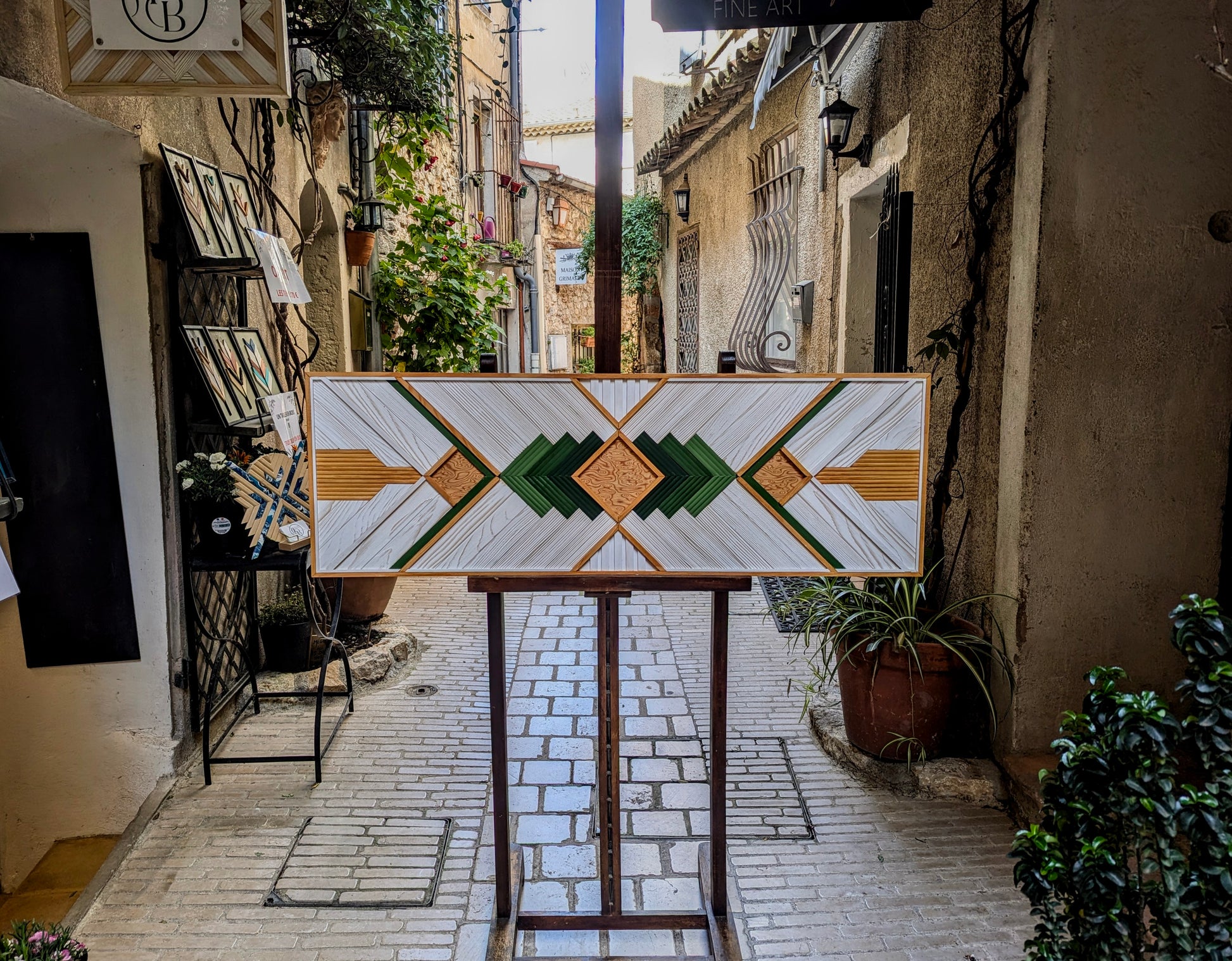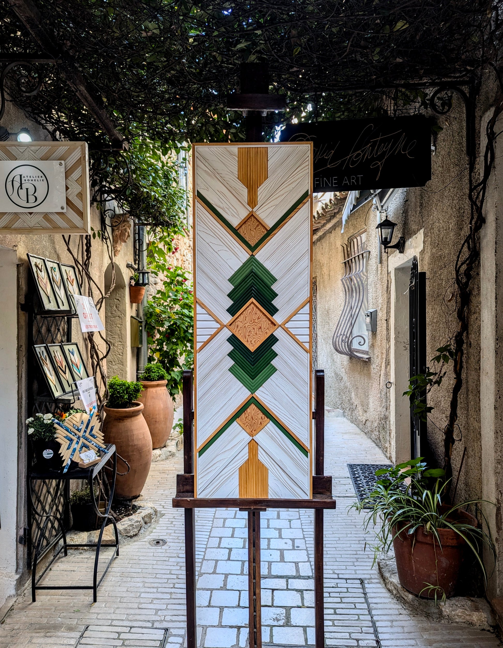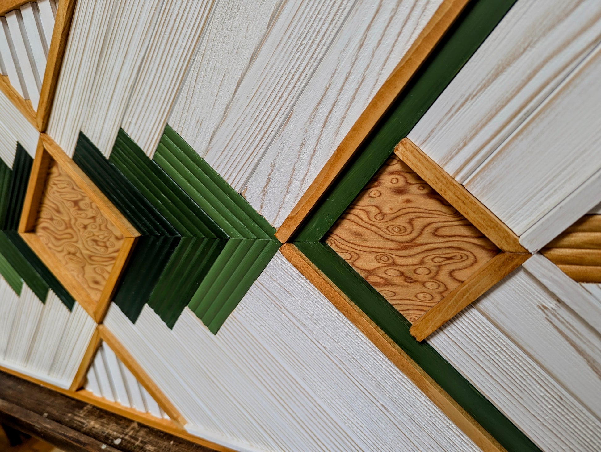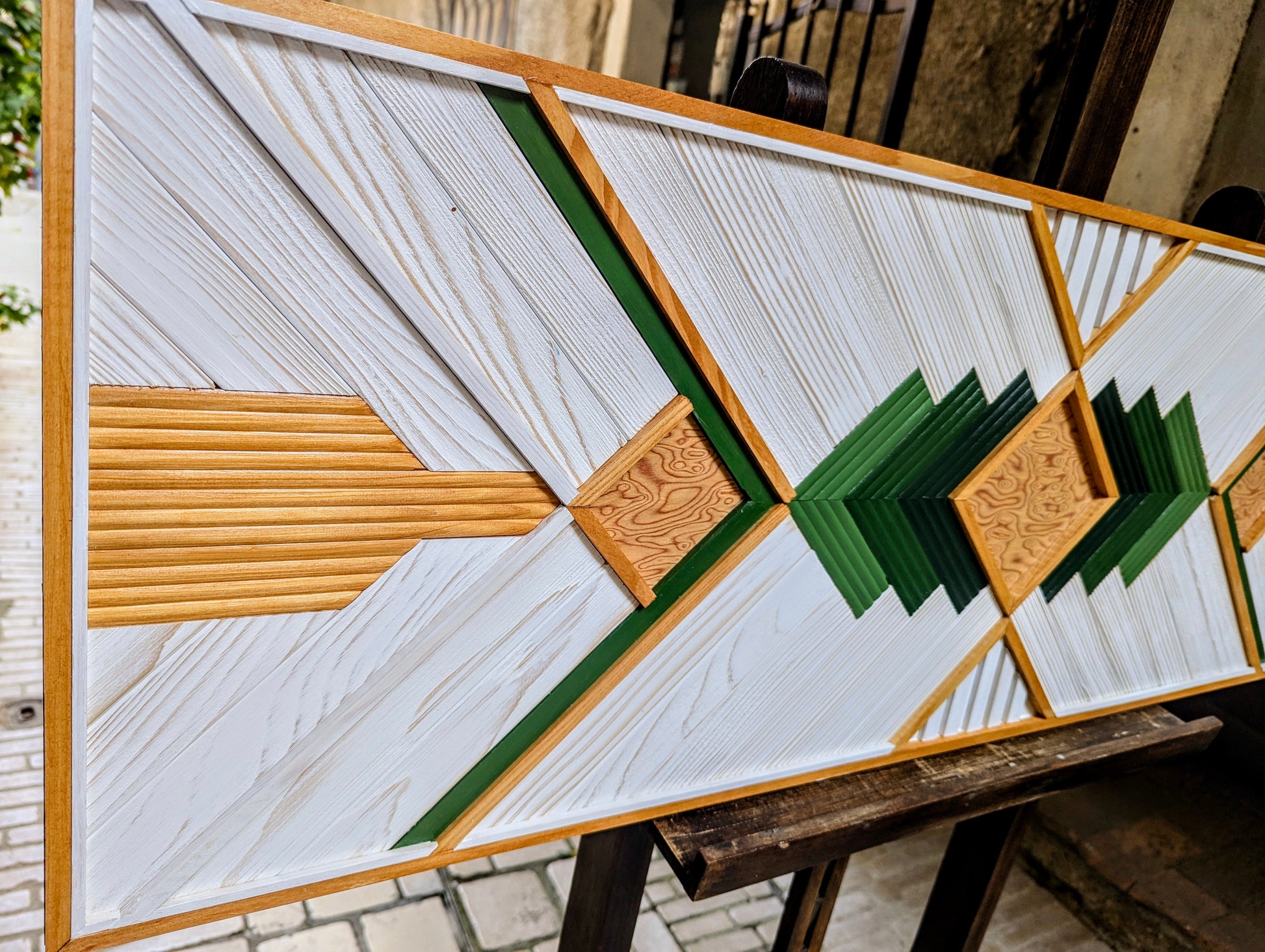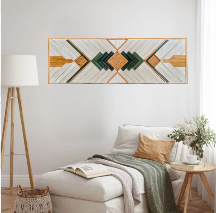 Cette œuvre allie l'élégance du minimalisme à une touche décorative raffinée. Les tasseaux de pin et d’ayou, dans leurs teintes naturelles, se mêlent harmonieusement avec le placage de bois de loup, apportant une profondeur supplémentaire grâce à sa texture unique. La combinaison des couleurs naturelles du bois, du blanc pur et du dégradé de vert olive crée un contraste apaisant, qui fait ressortir la beauté des matériaux tout en offrant une touche subtile de couleur.