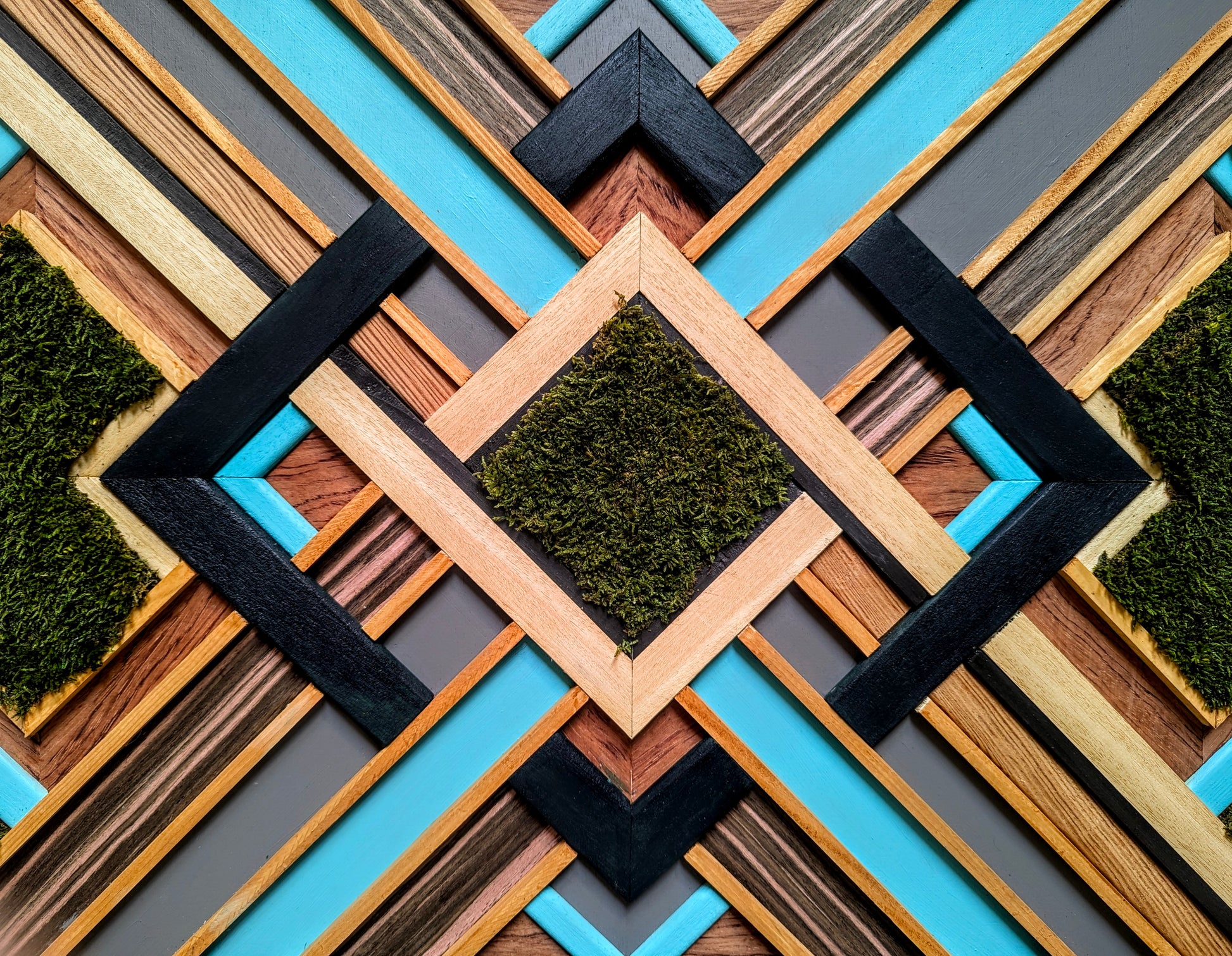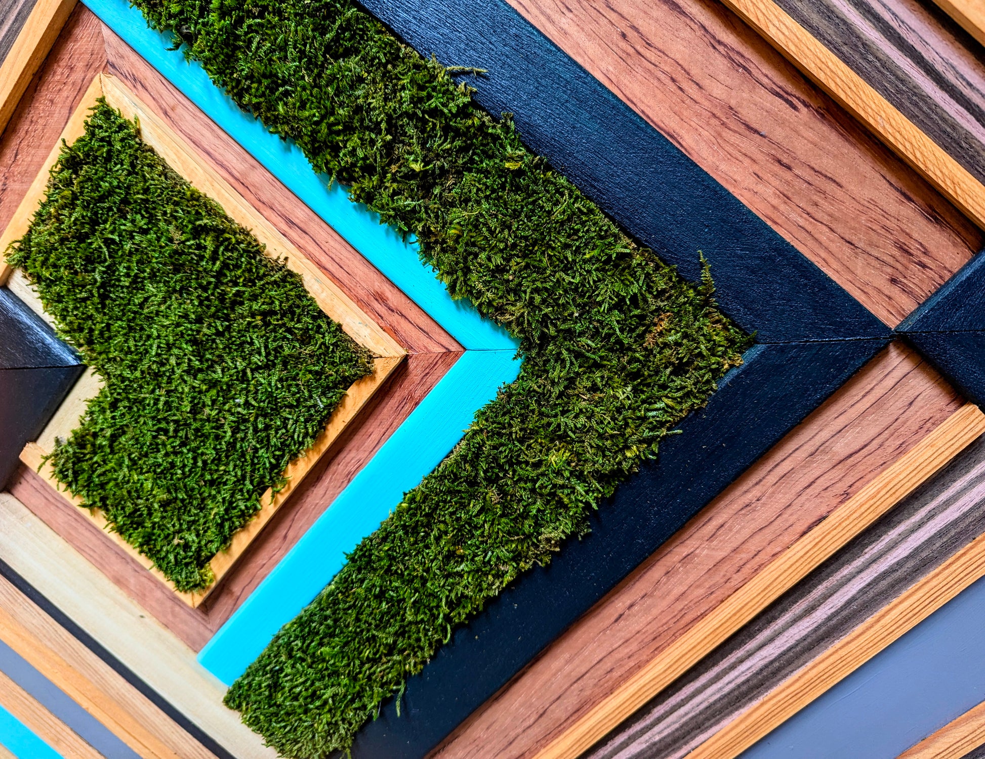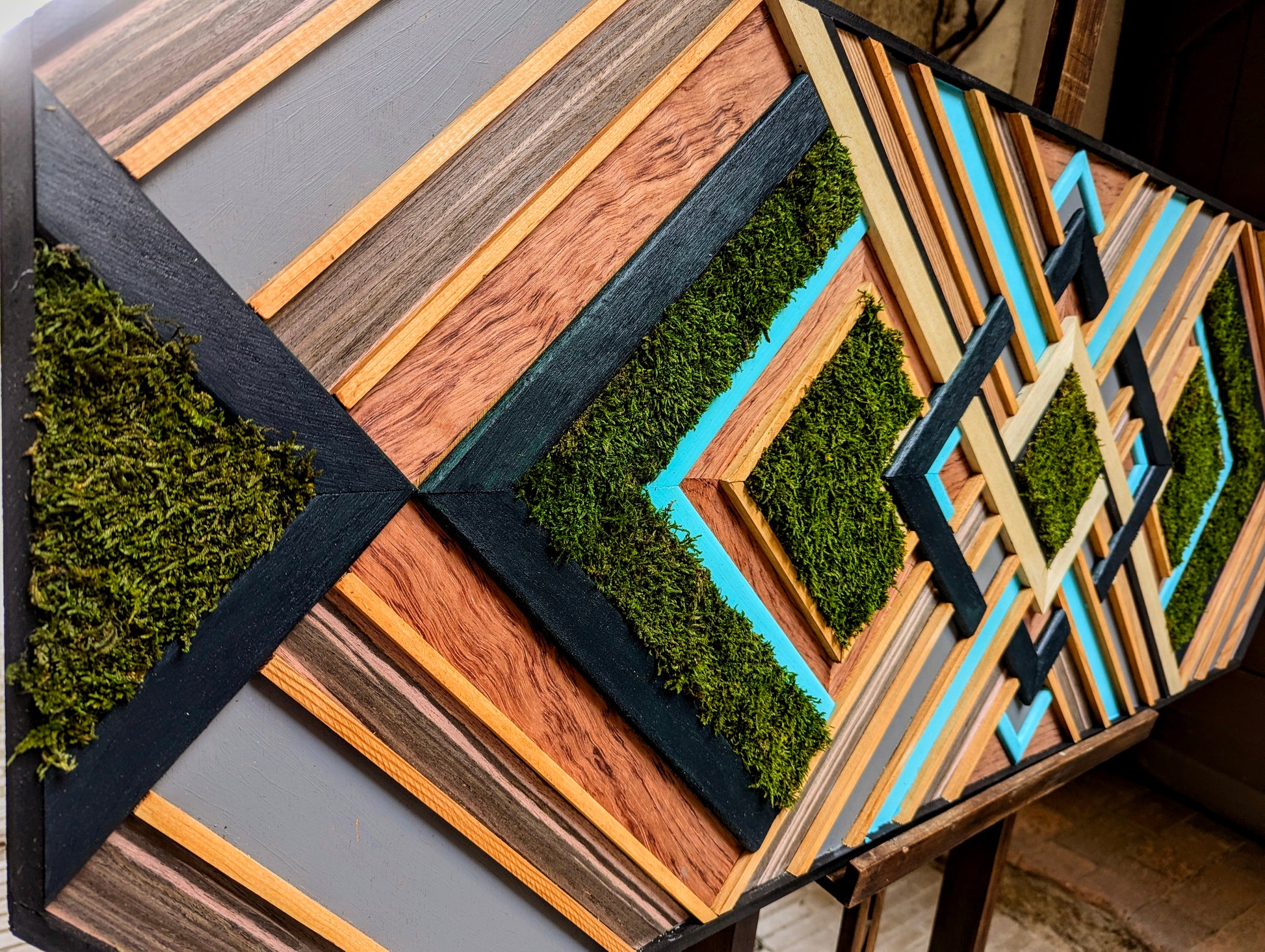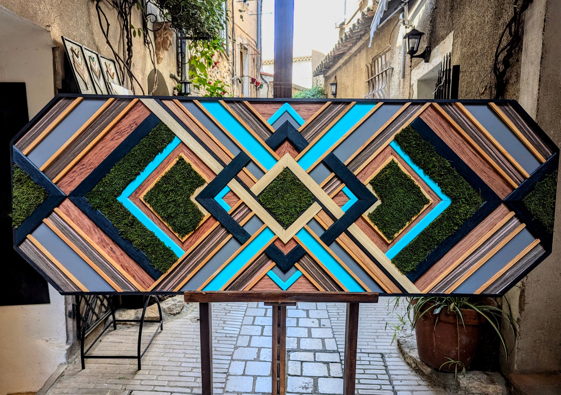 Cette œuvre contemporaine marie la chaleur et la richesse du bois avec la fraîcheur d'une végétation subtilement intégrée. Les placages de bois de rose et de poirier rouge, finement sélectionnés, s'entrelacent avec élégance, dévoilant leurs veines naturelles et leurs couleurs profondes. La mousse végétale stabilisée, ajoutée avec soin, offre une touche de verdure luxuriante qui contraste merveilleusement avec la texture lisse et raffinée des bois. Ce mélange unique crée une pièce où la nature et l'art coexistent harmonieusement, apportant une sensation de sérénité et d'authenticité.