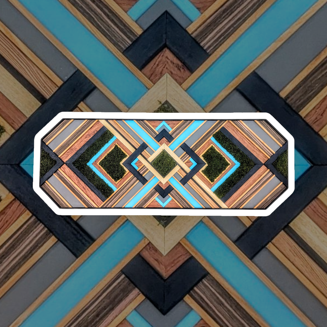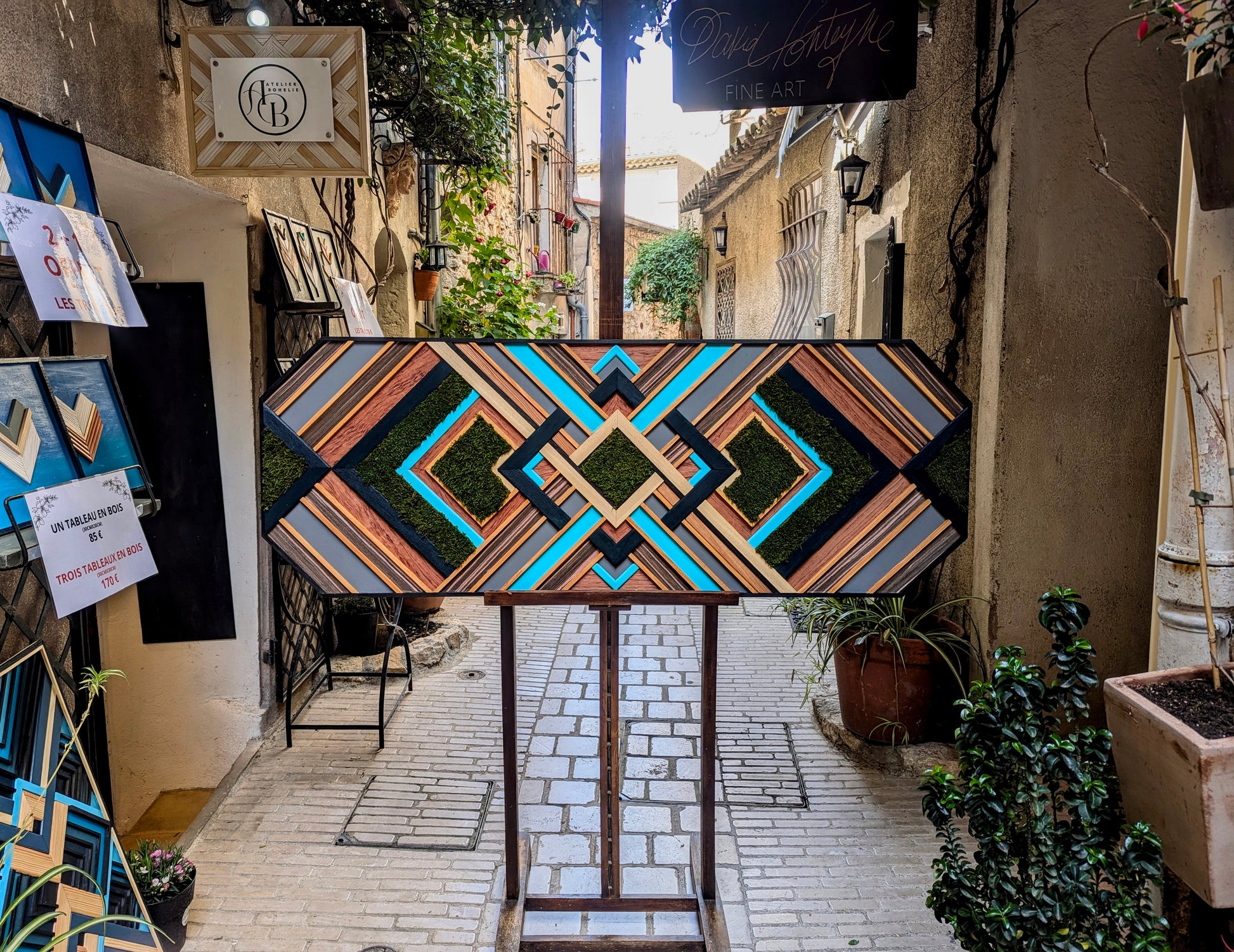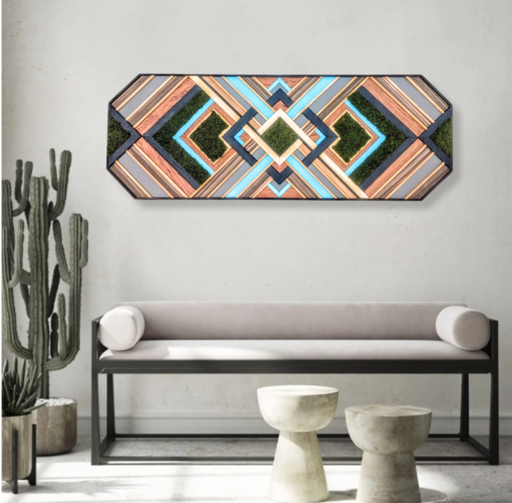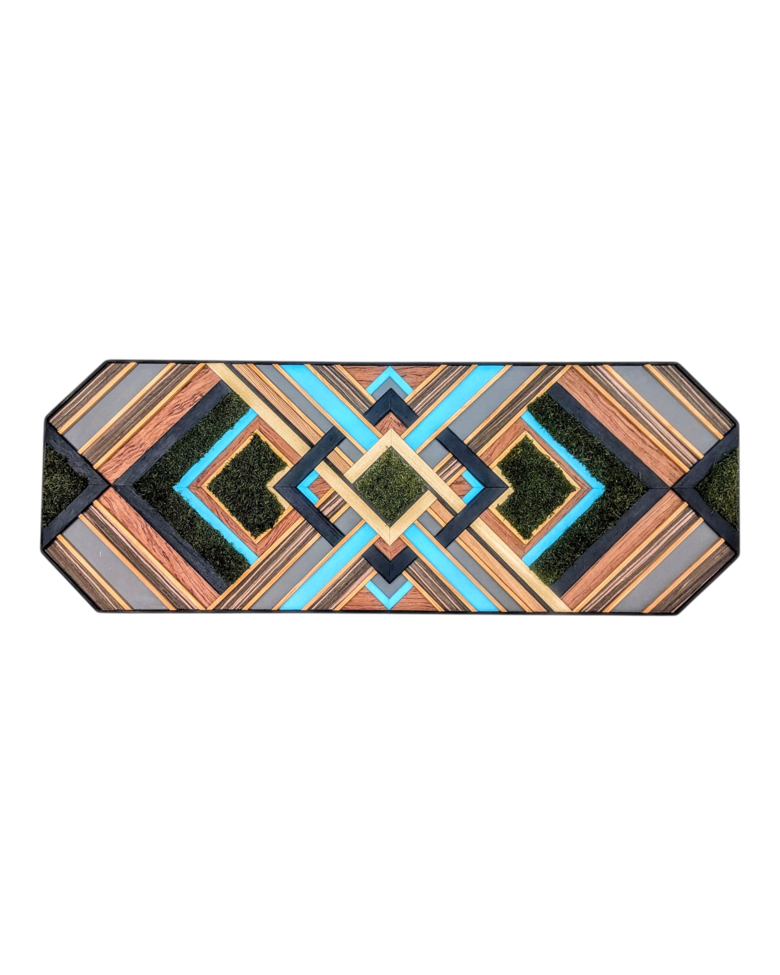 Cette œuvre contemporaine marie la chaleur et la richesse du bois avec la fraîcheur d'une végétation subtilement intégrée. Les placages de bois de rose et de poirier rouge, finement sélectionnés, s'entrelacent avec élégance, dévoilant leurs veines naturelles et leurs couleurs profondes. La mousse végétale stabilisée, ajoutée avec soin, offre une touche de verdure luxuriante qui contraste merveilleusement avec la texture lisse et raffinée des bois. Ce mélange unique crée une pièce où la nature et l'art coexistent harmonieusement, apportant une sensation de sérénité et d'authenticité.